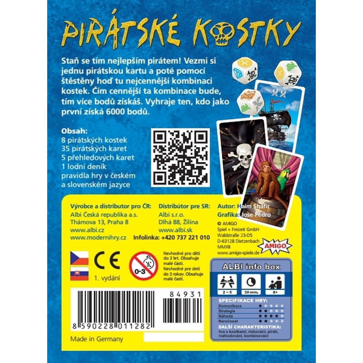 Vezmi si jednu pirátskou kartu a poté pomocí štěstěny hoď tu nejcennější kombinaci kostek. Čím cennější ta kombinace bude, tím více bodů získáš. Vyhraje ten, kdo jako první získá 6000 bodů. Hra obsahuje 8 pirátských kostek a 40 pirátských karet.