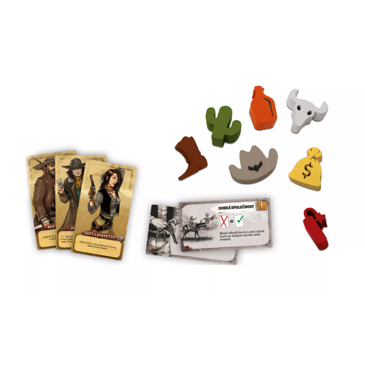 Obsah: 32 hracích kariet, 16 kariet postáv, 16 kariet činov, 35 drevených žetónov slávy, CZ/SK pravidlá