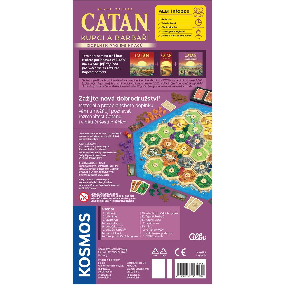atan – Kupci a barbari 5–6 hráčov prináša ešte bohatší zážitok z Catanu tým, že umožňuje zapojiť do hry ďalších dvoch hráčov. Ostrov sa stáva živším, súboje o suroviny napínavejšími a stratégie rozmanitejšími. Viac figúrok, viac krajín a dynamickejší priebeh robia z každej partie skutočnú výpravu plnú nečakaných zvratov.