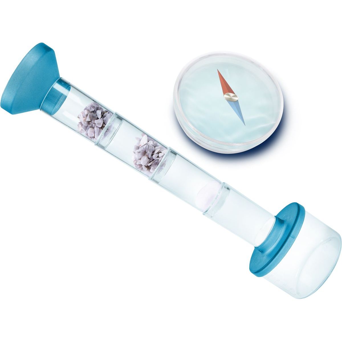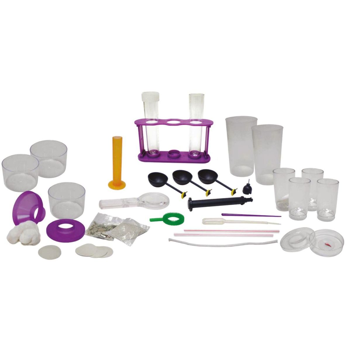 Obsah: plastové trubice, lievik, kryt, kelímky, vrecká s oblázkami a mramorovými kamienkami, filtračné papiere, hubka, skúmavky, zátka s otvorom, stojan na skúmavky, slamky, odmerný valec, Petriho miska, kompas do vody, veterné lopatky s držiakom a madlom, pipeta, bavlnený povrázok, lupa, vatové guľôčky, bublifuková palička, miešacia tyčinka, návod