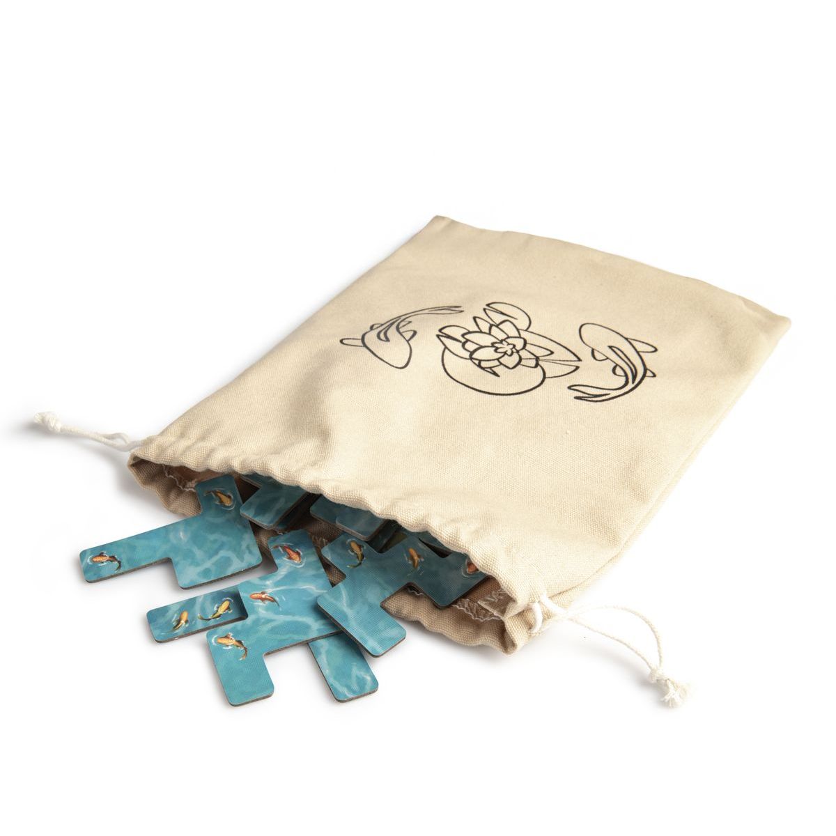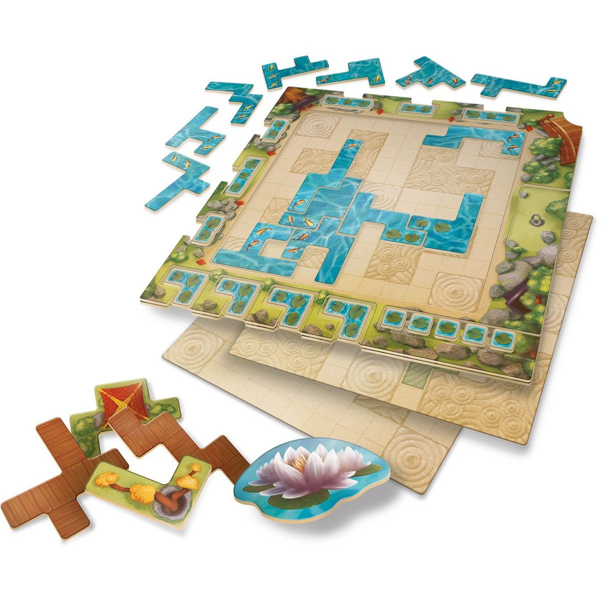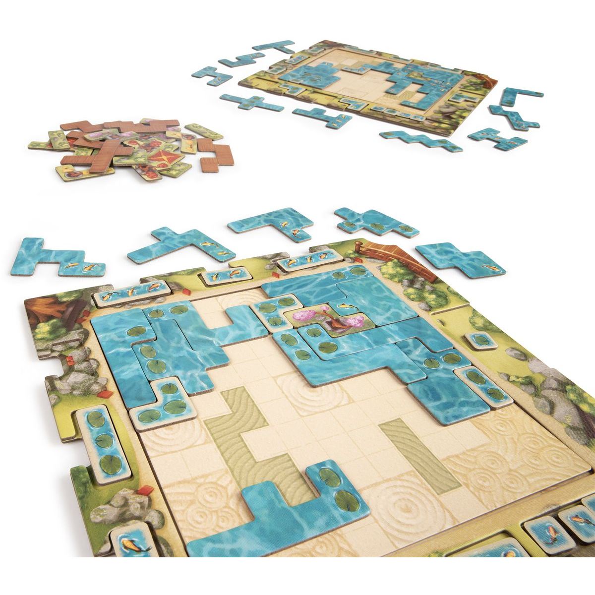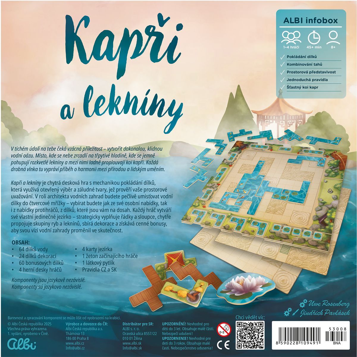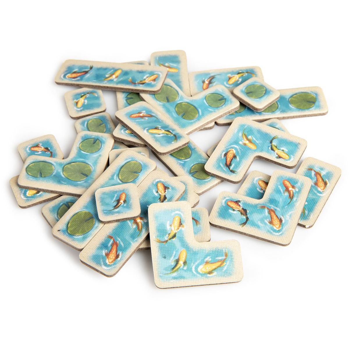 Vytvorte si vlastné okrasné jazierko v stolovej hre Kapři a lekníny od Uweho Rosenberga. Pokladajte dieliky vody v tvare heptomin, tvorte veľké skupiny kaprov a lekienov a získavajte bonusové dieliky, ktoré vám pomôžu zaplniť medzery. Hra kombinuje rýchlosť, stratégiu a priestorové plánovanie a ponúka zábavný a relaxačný zážitok pre celú rodinu.