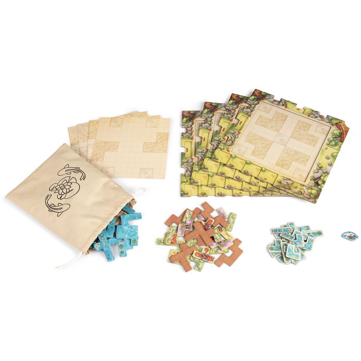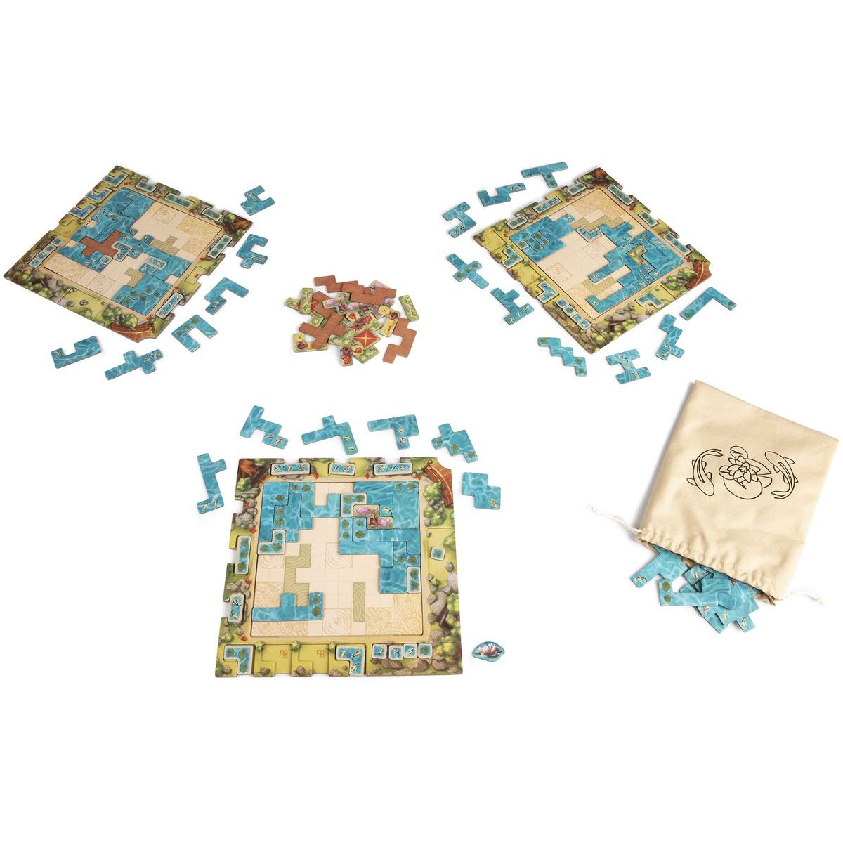 Obsah balenia: 64 dielikov vody, 18 dielikov dekorácií, 60 bonusových dielikov (15 pre každého hráča), 4 dosky hráča, 4 karty jazierka, plátený pytlík, české a slovenské pravidlá