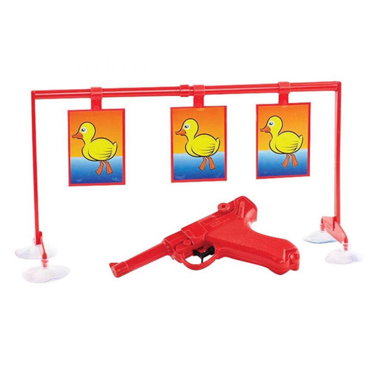 Balení obsahuje vodní pistolku, 4 otáčející se tabulky s kachničkami a desku s přísavkou.