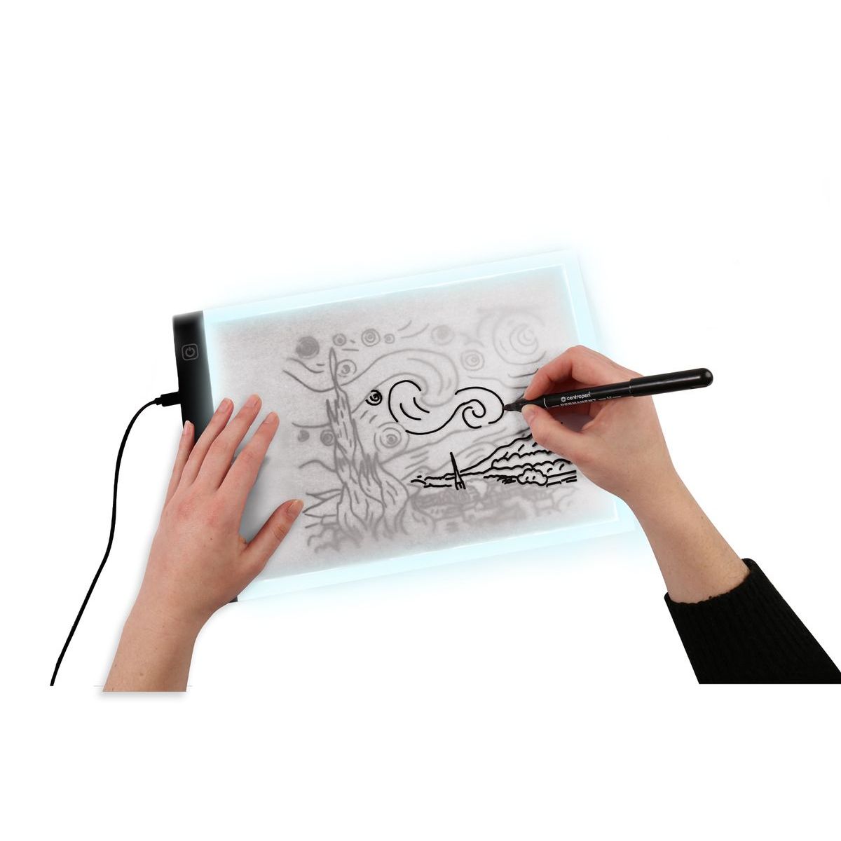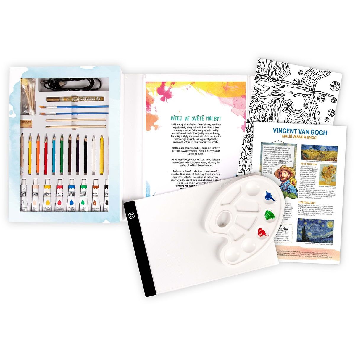 Obsah: LED tabuľa, pracovný blok, farebné papiere, štetce, farby, pastelky