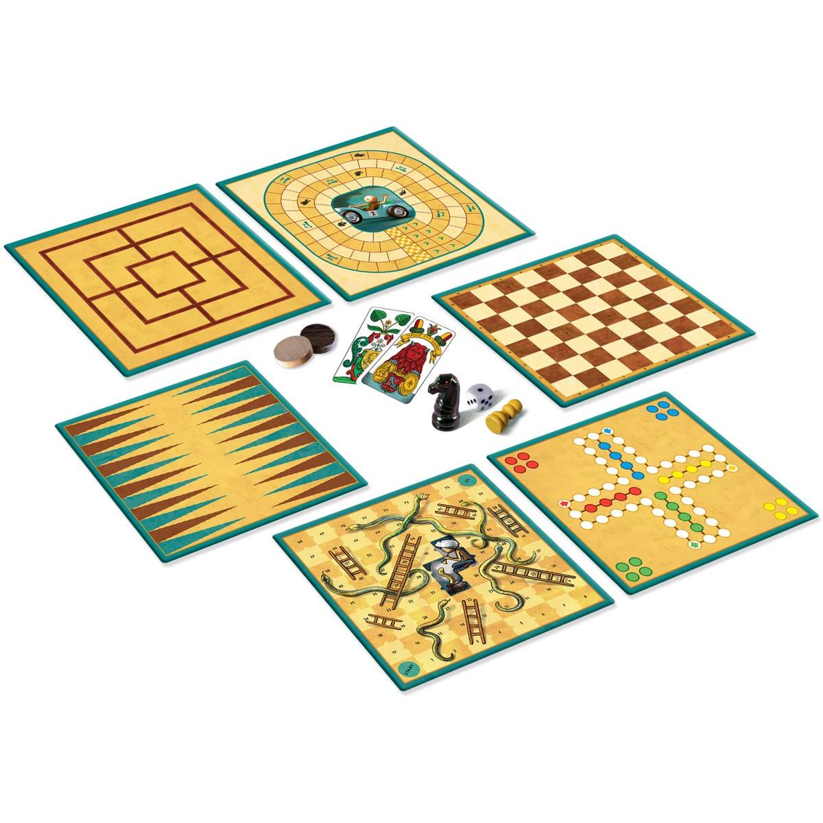 Obsah sady: 3 obojstranné herné plány, 32 plastových šachových figúrok, 30 drevených kameňov, 16 drevených figúrok, 6 kociek, 32 kariet, české a slovenské pravidlá