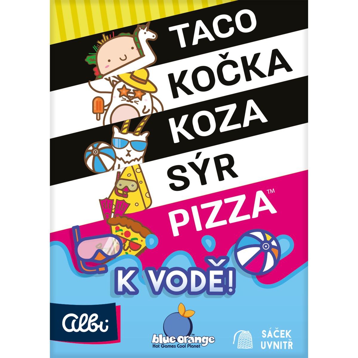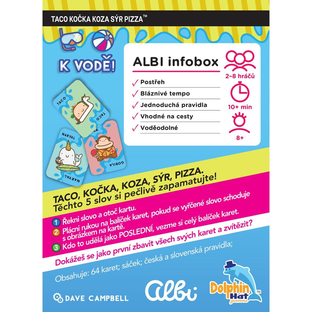 S Albi Taco, mačka k vode zažijete rýchlu a bláznivú zábavu pre celú rodinu! Opakujte päť slov – Taco, mačka, koza, syr, pizza – a buďte neustále v strehu, pretože kto zareaguje najpomalšie, prehráva kolo. Vodoodolné karty umožňujú hrať pri bazéne, na pláži alebo na dovolenke, a praktický sťahovací sáčok zabezpečí, že hra je vždy po ruke.