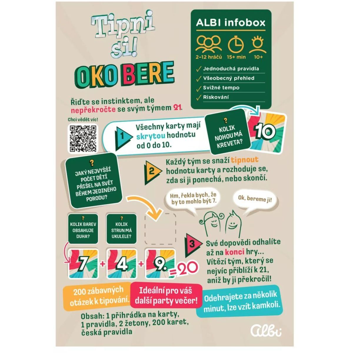 Napätie stúpa, čísla sa sčítavajú a každý tip môže rozhodnúť. Albi Tipni si! Oko berie je zábavná tímová hra, v ktorej sa spoliehate nielen na vedomosti, ale najmä na inštinkt a odvahu riskovať. Každá karta ukrýva číslo od 0 do 10 a odpoveď na otázku, ktorú sa snažíte správne odhadnúť.
