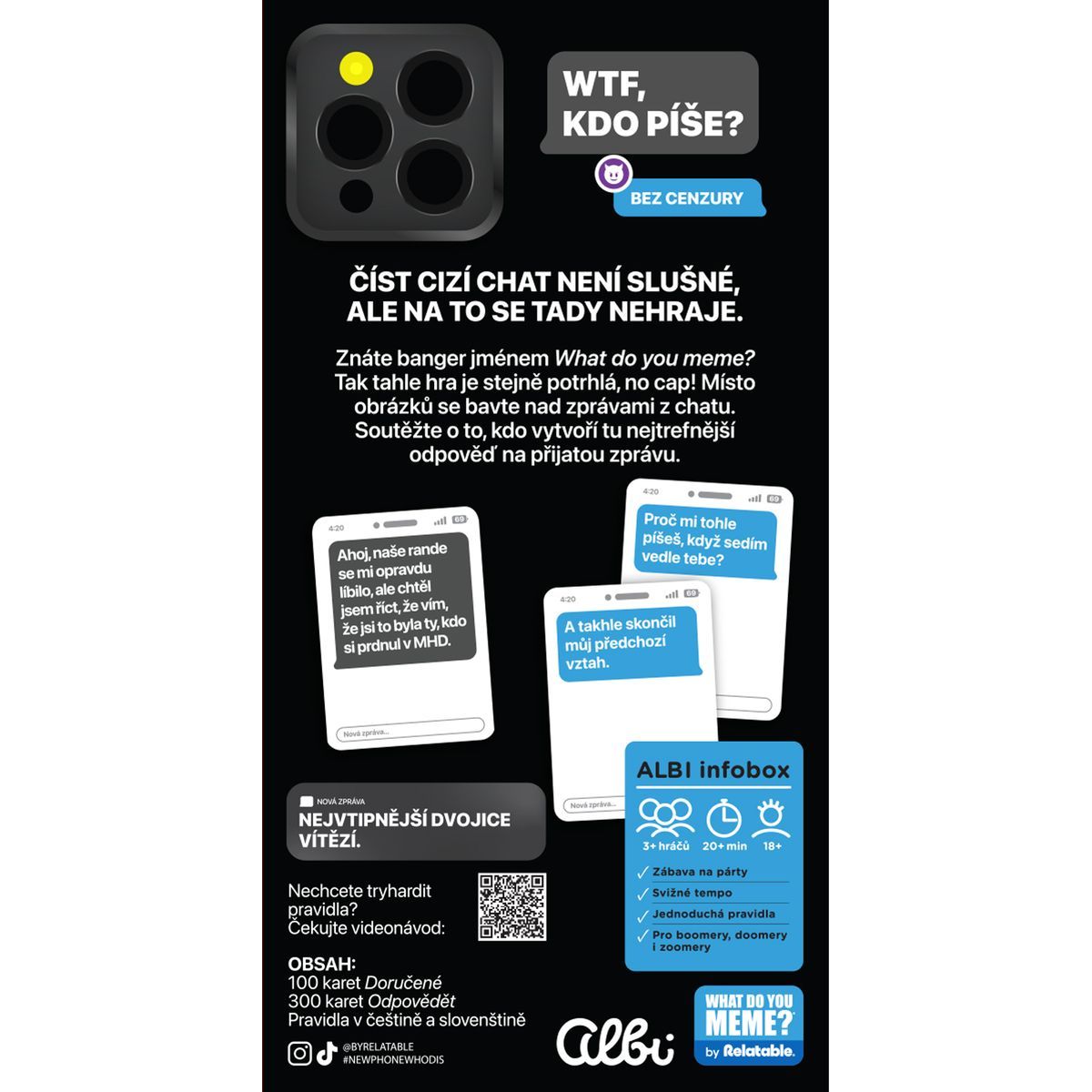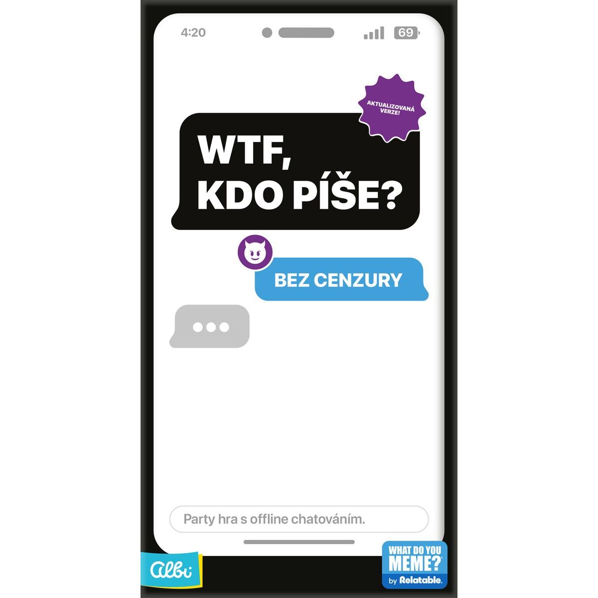 Zažite zábavu s Albi WTF, kto píše?, párty hrou, ktorá baví všetkých závislákov na messengeri! Hráči súťažia, kto nájde najvtipnejšiu a najvhodnejšiu odpoveď na danú správu. Ideálna na večierky, stretnutia s priateľmi alebo len pre smiech pri rodinnom hraní. Hra rozvíja kreatívne myslenie, humor a rýchlu reakciu.