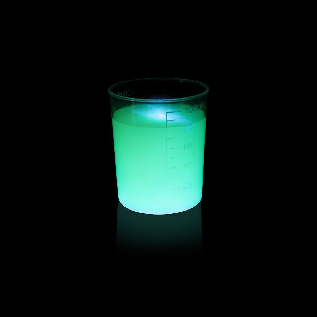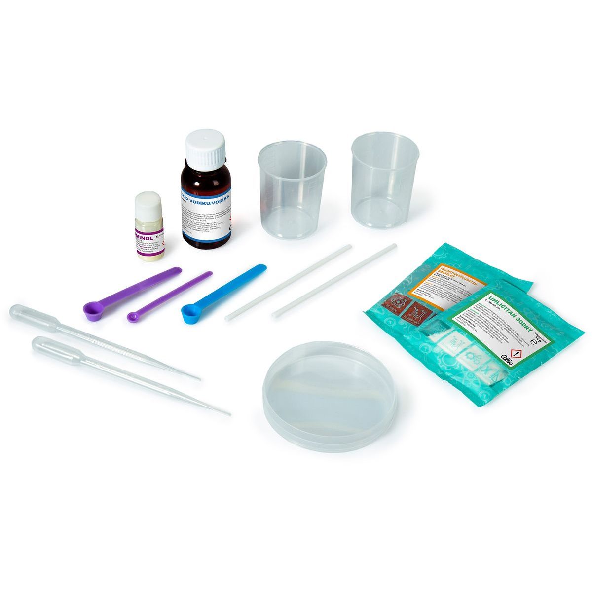 Obsah: fľaštička Luminolu, sáčok uhličitanu sodného, sáčok hexakyanoželezitanu draselného, sáčok s fľaštičkou peroxidu vodíka, 1 malá fialová lyžička, 1 fialová a 1 modrá lyžica, 2 pipety, 2 miešacie tyčinky, 2 odmerky, 1 Petriho miska