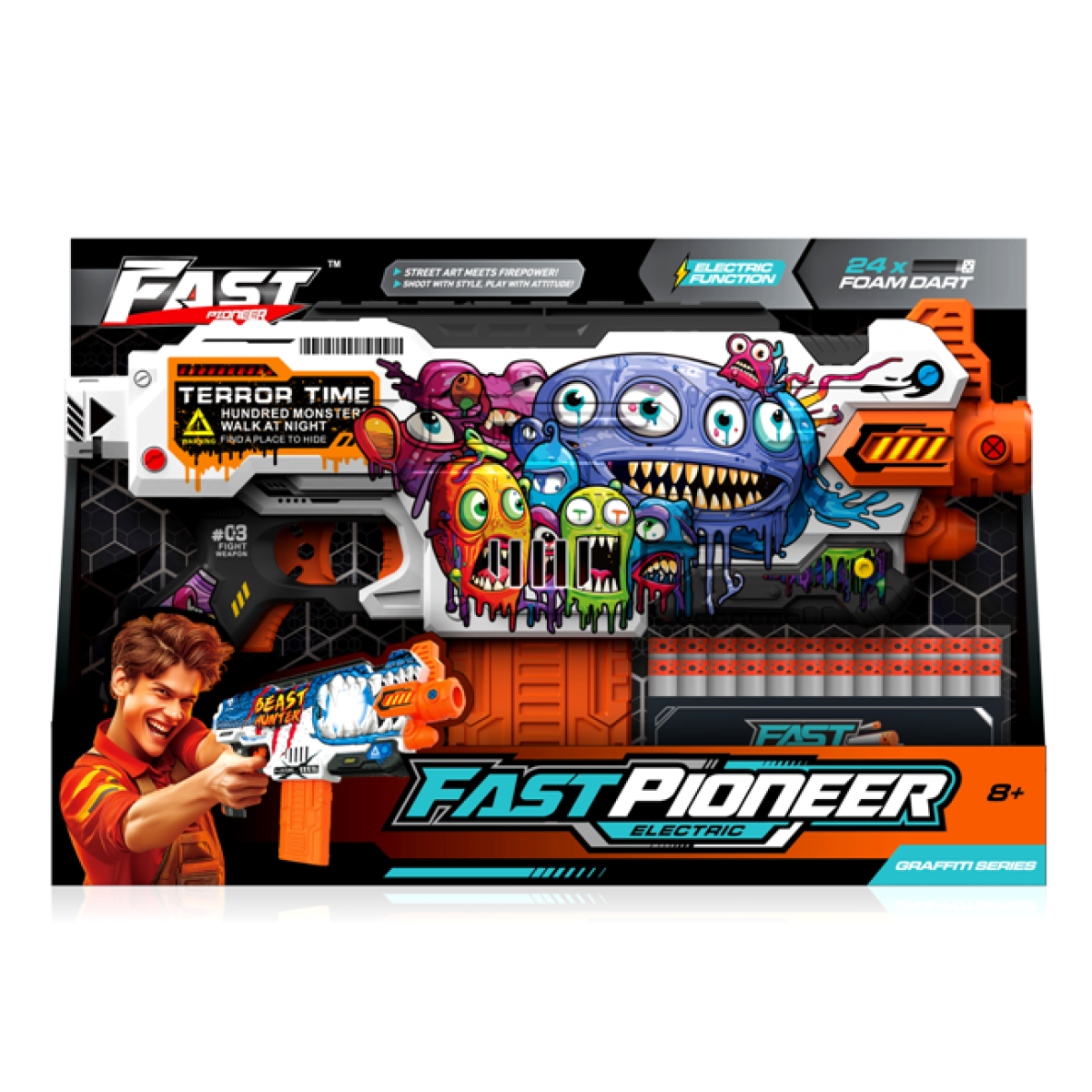 Zažite vzrušenie s elektrickou hračkou Alltoys Fast pioneer blaster! Stačí vložiť jeden z 24 mäkkých penových nábojov a stlačiť spúšť pre rýchlu a plynulú streľbu vhodnú pre deti od 8 rokov. Táto hračka je bezpečná, ľahko sa ovláda a je perfektná na hranie doma aj vonku. Balenie neobsahuje batérie, potrebných je šesť kusov AA pre dlhú výdrž hry. S moderným dizajnom bude táto hračka obľúbeným spoločníkom všetkých malých strelcov!