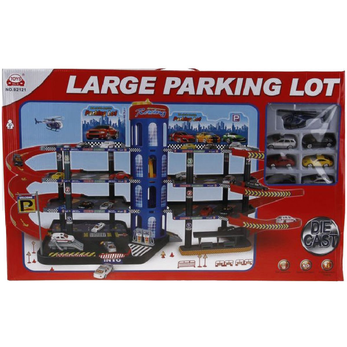 Velká plastová garážová sada má čtyři podlaží, čerpací stojany, výtah. Sada obsahuje dopravní značení, šest kovových autíček a vrtulník.