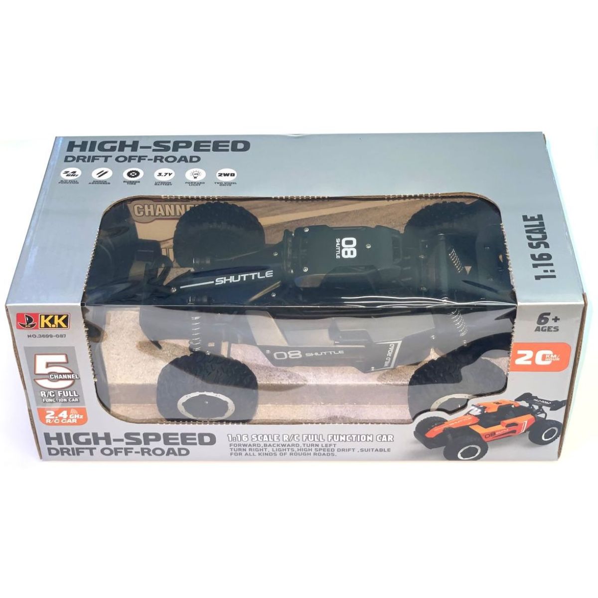 Auto je pripravené na akciu – v balení nájdete nabíjateľnú batériu a USB kábel, stačí len doplniť 2× AA batérie do ovládača. Vyberte si z atraktívnych farieb (čierna, oranžová, modrá) a pustite sa do pretekov!