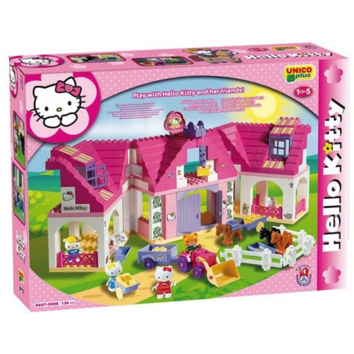 Stavebnice obsahuje traktůrek, vozík, koně, kravičku, prasátko, další doplňky a figurky Hello Kitty a jejích přátel.