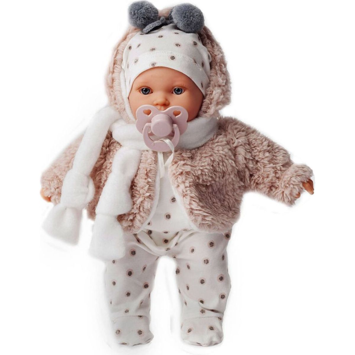 Postavička má mäkké látkové telo, hlava a končatiny sú z vinylu. Obleček má z materiálu príjemného na dotyk. Tentoraz má oblečené svetlé dupačky s jemnou vzorkou a huňatý kabátik so šálom. Na hlave má čiapočku s brmbolcami.