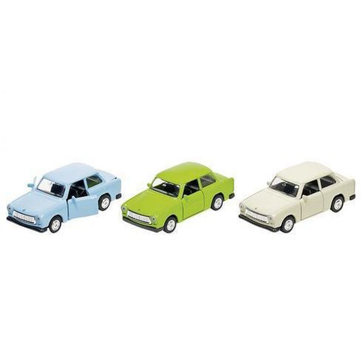 Modrý trabant, symbol bývalé NDR s karoserií vyrobené z duroplastu, vynikal vždy svou lehkou konstrukcí. Model funguje na zpětné natažení a jdou mu otevírat dveře.