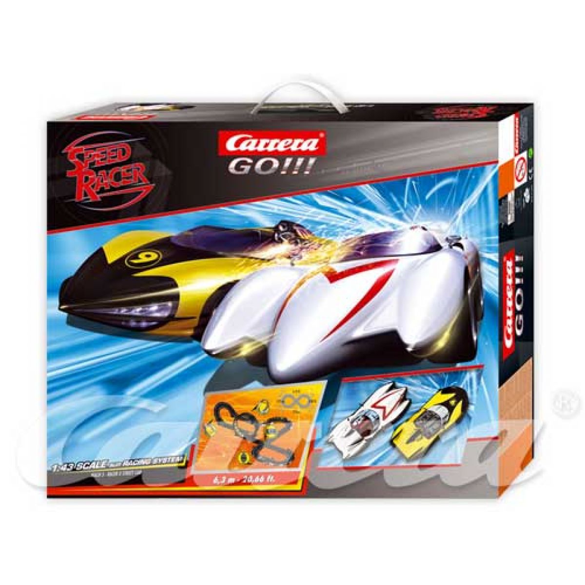 Legendární japonská komiksový seriál jako autodráha Carrera. Hlavní hrdina Speed Racer s autem Mach 5 proti soupeři Racer X na trati dlouhé 6,3 m! Základní set řady GO!!!, vhodný pro děti, s mechanickým počítadlem kol a auty Nissan a Corvette.