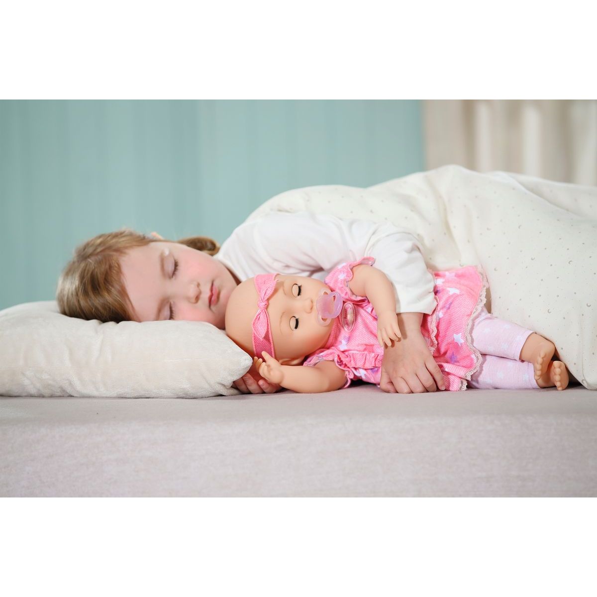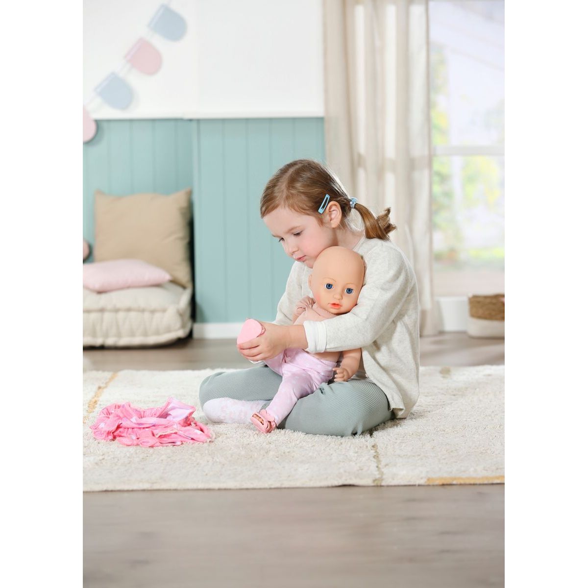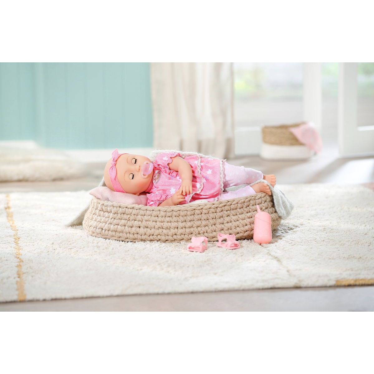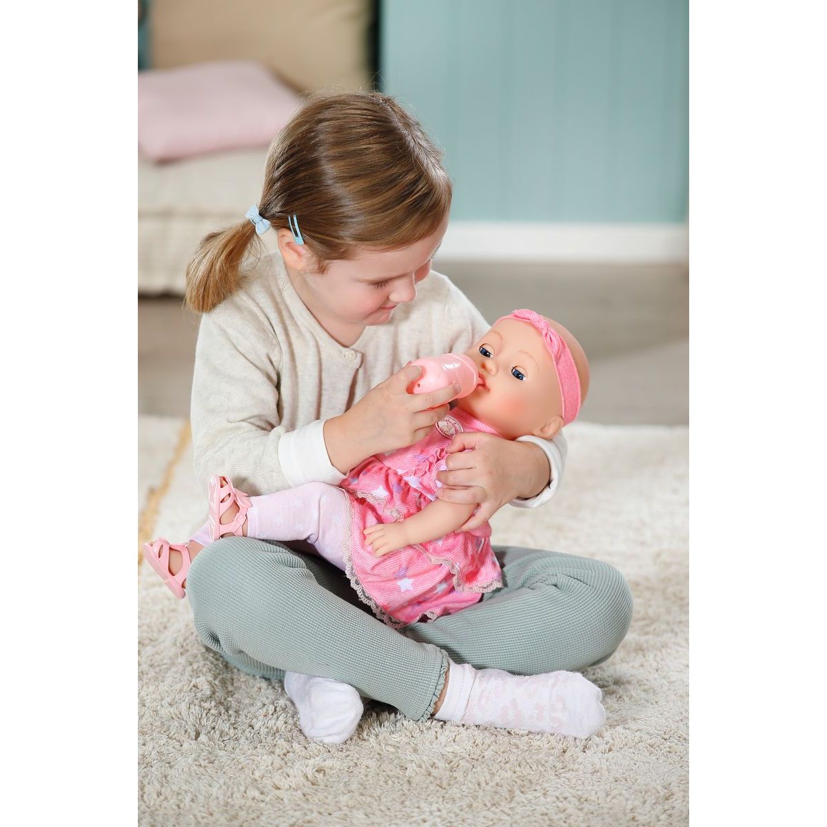 Má na sebe oblečené ružové šatôčky s krátkymi rukávmi a volánikovou sukienkou. Zdobené sú vzorom hviezdičiek, pod nimi má Mia svetlo ružové legíny a na hlave ružovú čelenku. Dievčatká ju môžu obliekať, ukolísať k spánku a kŕmiť.