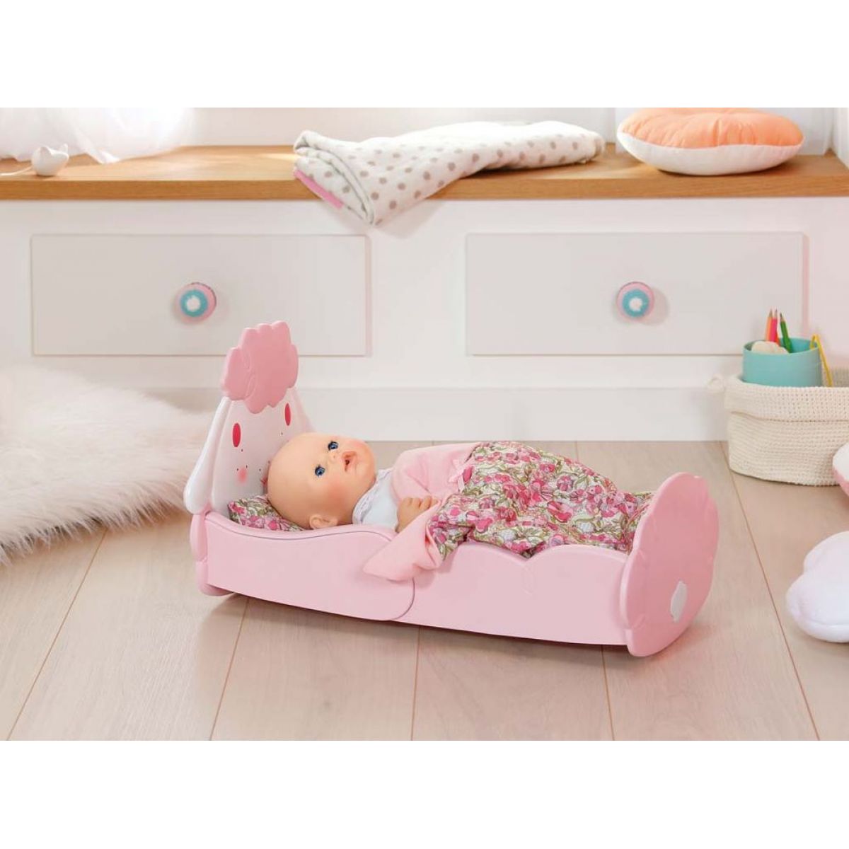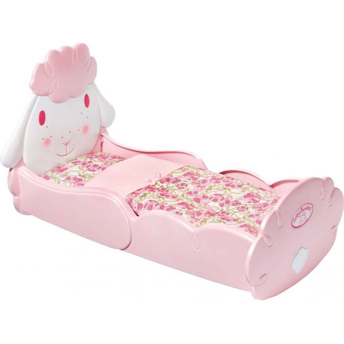 Ružová postieľka v tvare ovečky pre bábiku Baby Annabell. Postieľka je vybavená pohodlným matracom, dečkou a vankúšikom s kvetinovým vzorom. Bábiku v postieľke je možné aj hojdať.