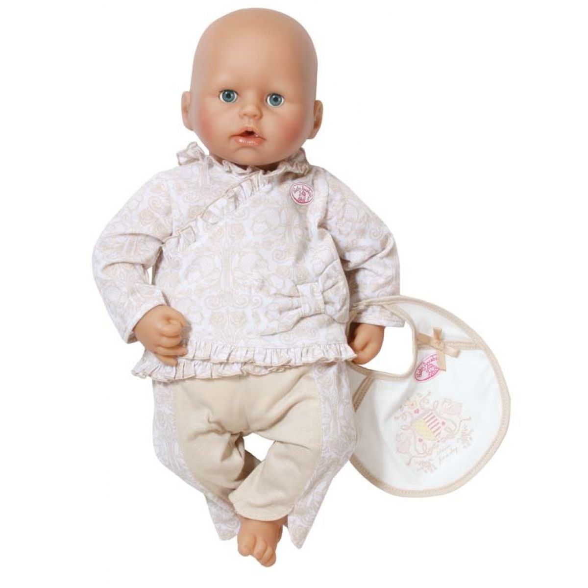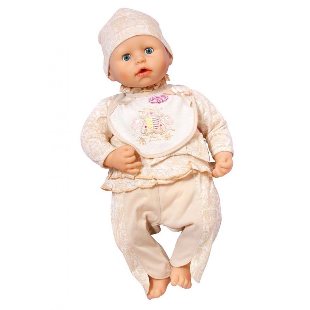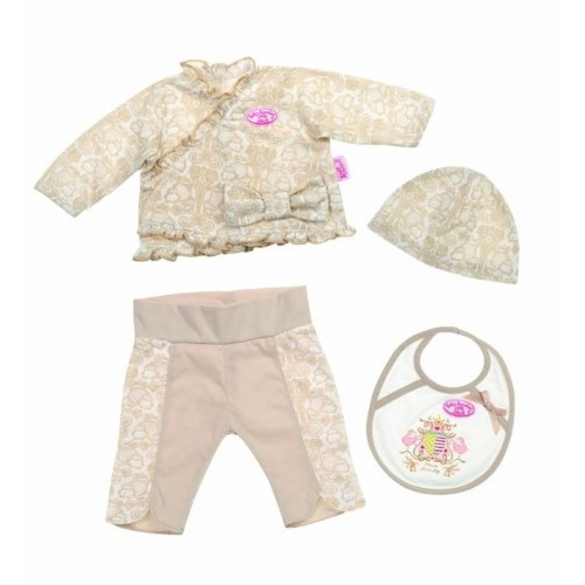 Soupravička ve zlatavé barvě pro malou princeznu Baby Annabell. Součástí soupravy jsou kalhoty, kabátek s mašlí, čepička a bryndáček.