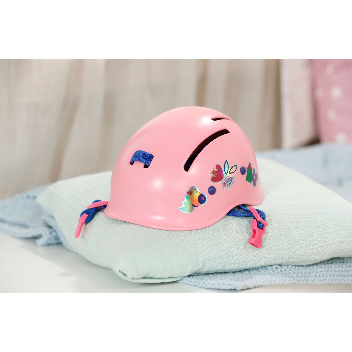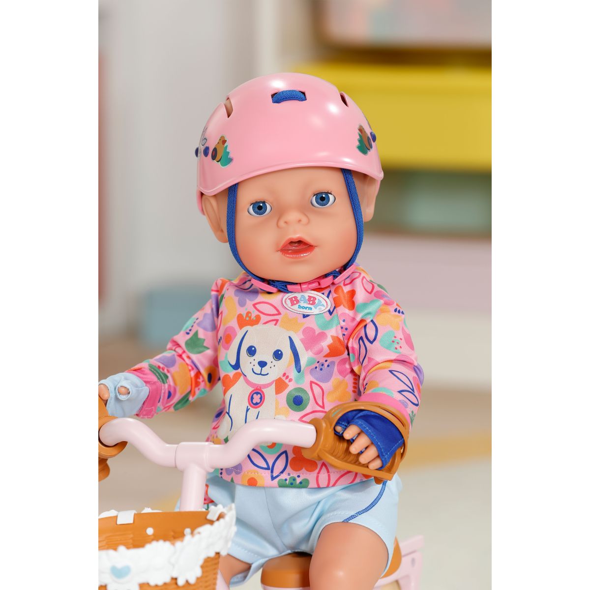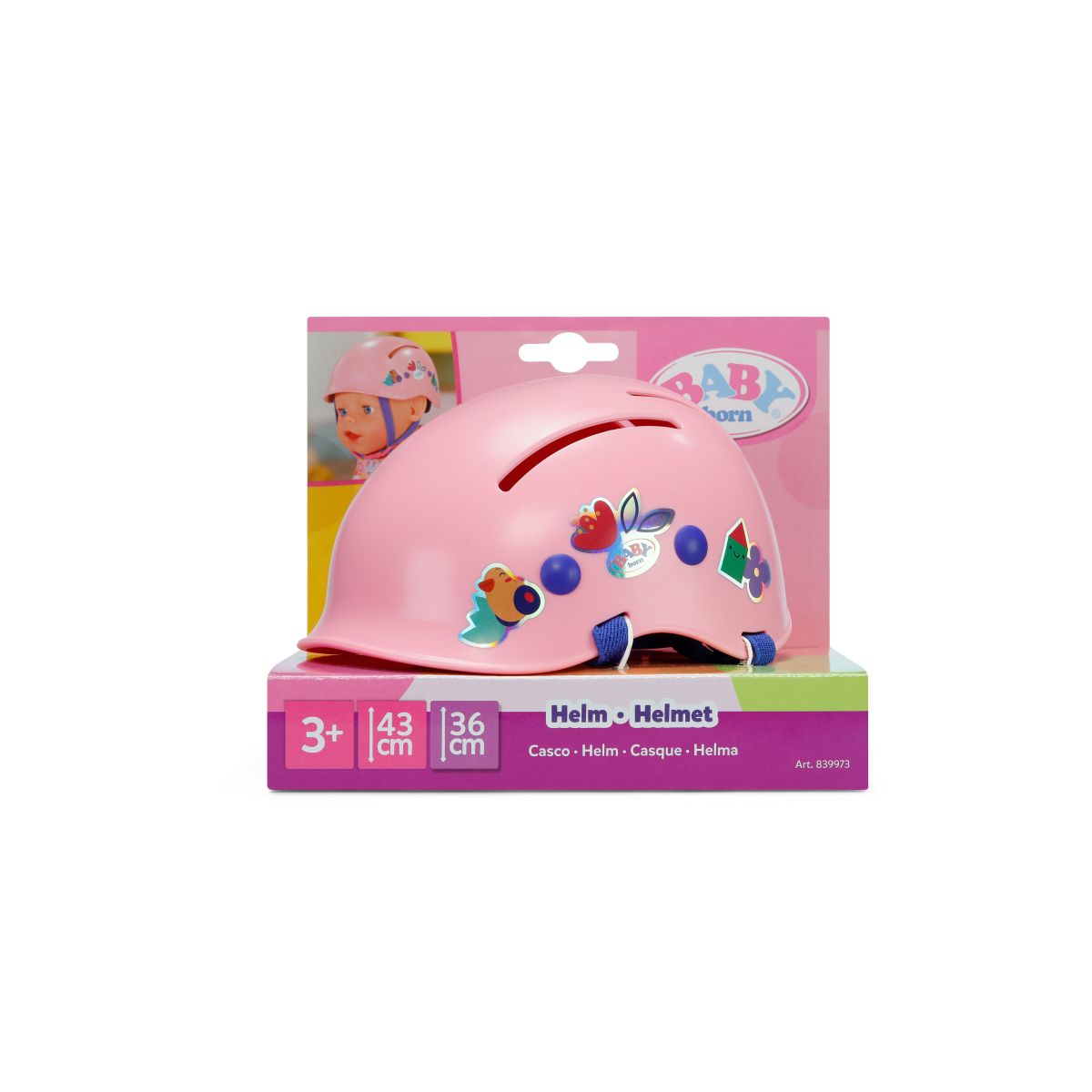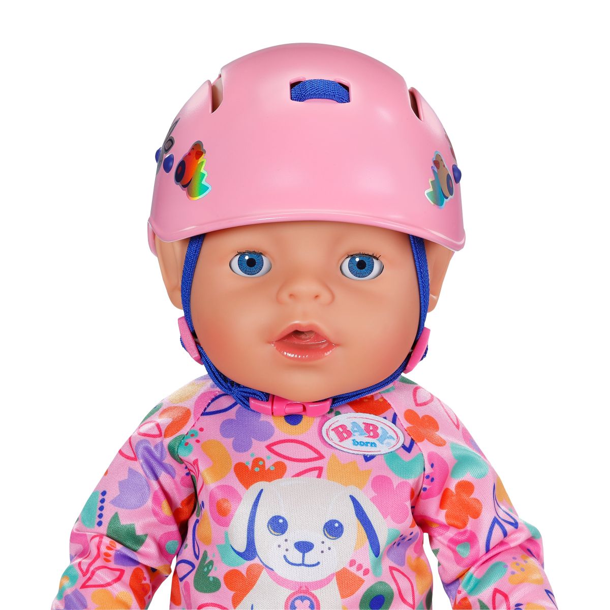 Prilba s farebnými motívmi nielen pekne vyzerá, ale aj hravou formou učí deti o bezpečnosti pri jazde na bicykli alebo kolobežke. Vďaka nastaviteľnej vnútornej časti perfektne sadne bábikám BABY born veľkosti 43 cm – Emme, Carle alebo Eve.