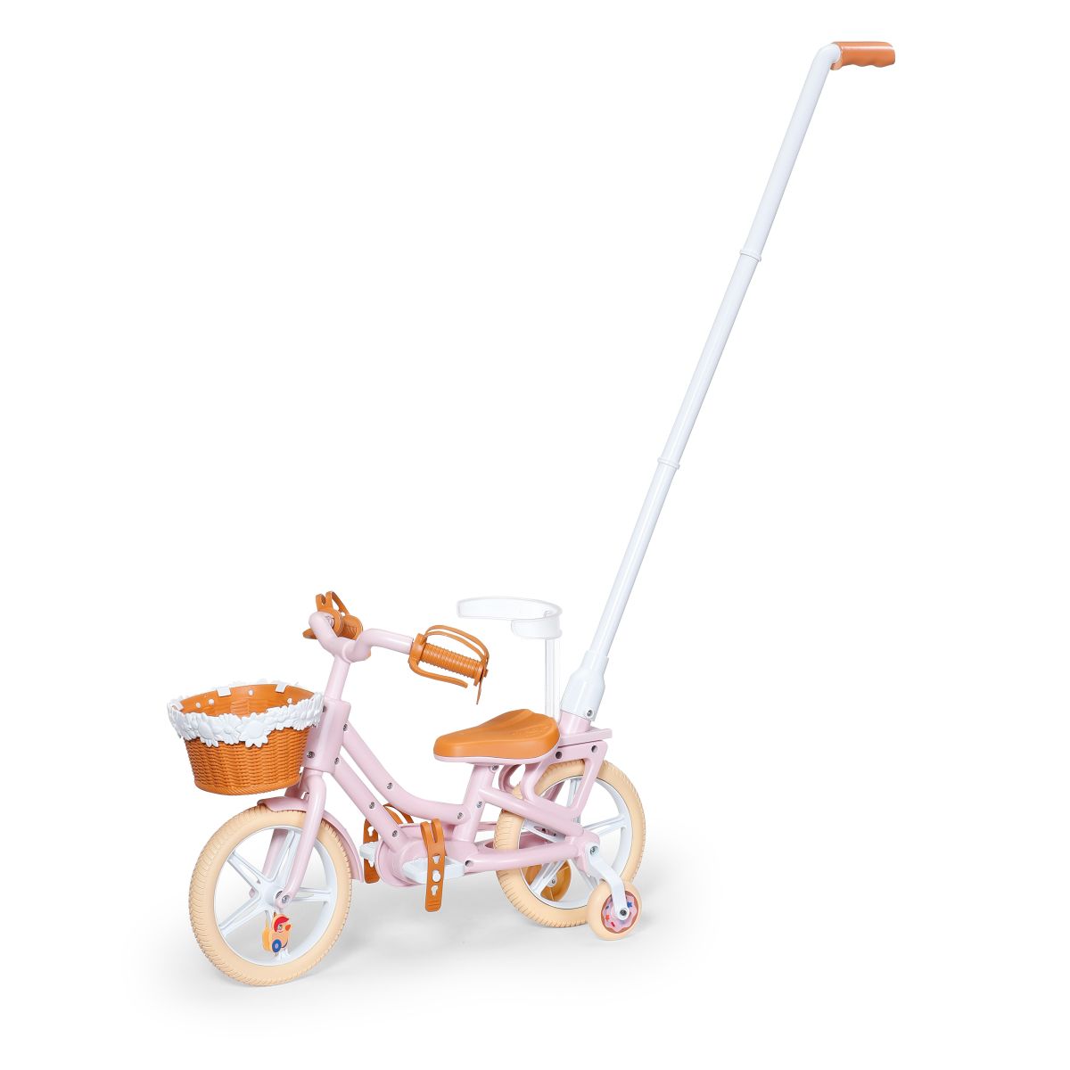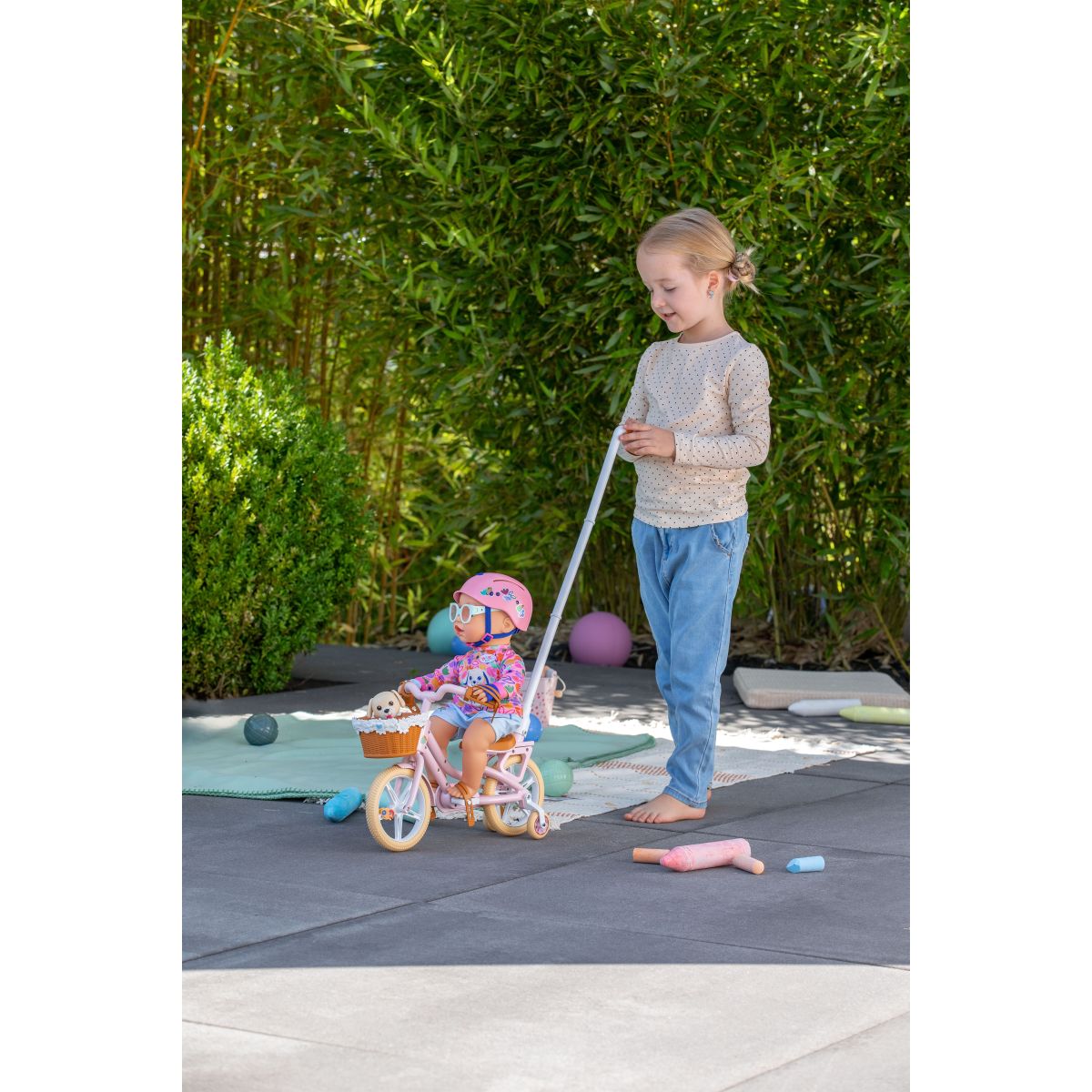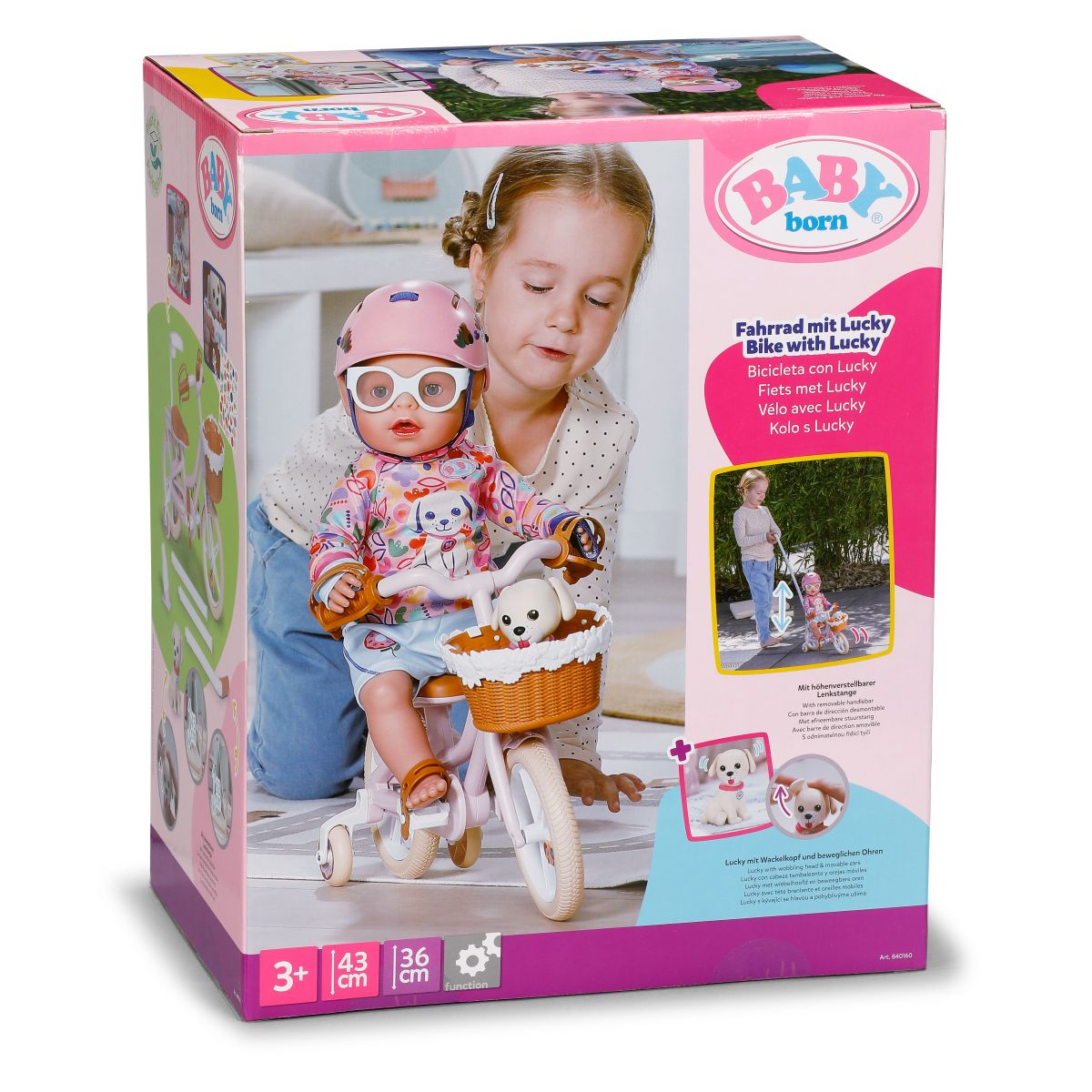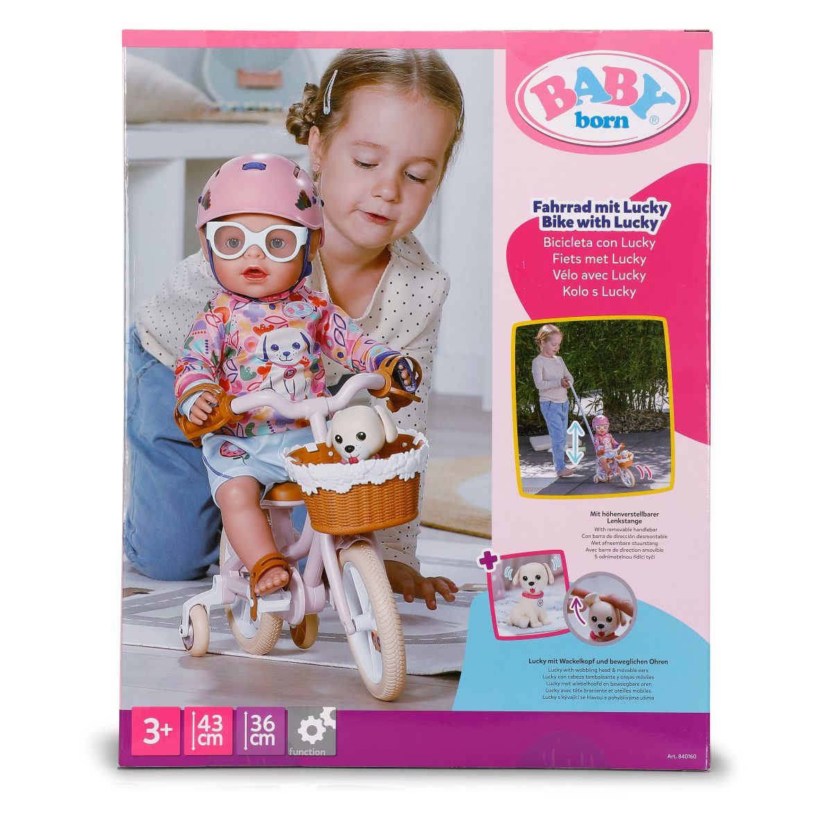 Bicykel má výškovo nastaviteľnú vodítkovú tyč pre jednoduché vedenie a bábika je bezpečne uchytená vďaka držiaku sedadla aj popruhom na pedáloch a riadidlách. Psík Lucky má kývajúcu hlavu a pohyblivé uši, ktoré prinášajú do hry ešte viac zábavy. Odnímateľný košík si môžete ozdobiť priloženými nálepkami podľa vlastnej fantázie.