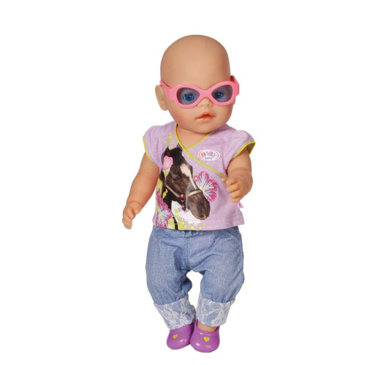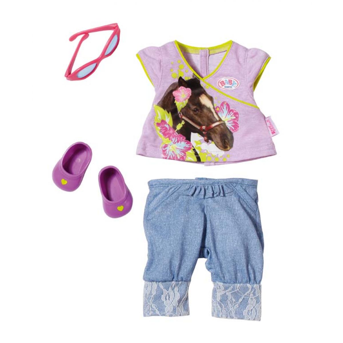 Krásna a praktická vychádzková súprava pre bábiku Baby Born. Sada oblečenie obsahuje tričko s potlačou koňa, slnečné okuliare, topánky a džínsové nohavice alebo sukňu. Súprava je pre bábiku vysokú 43 cm.