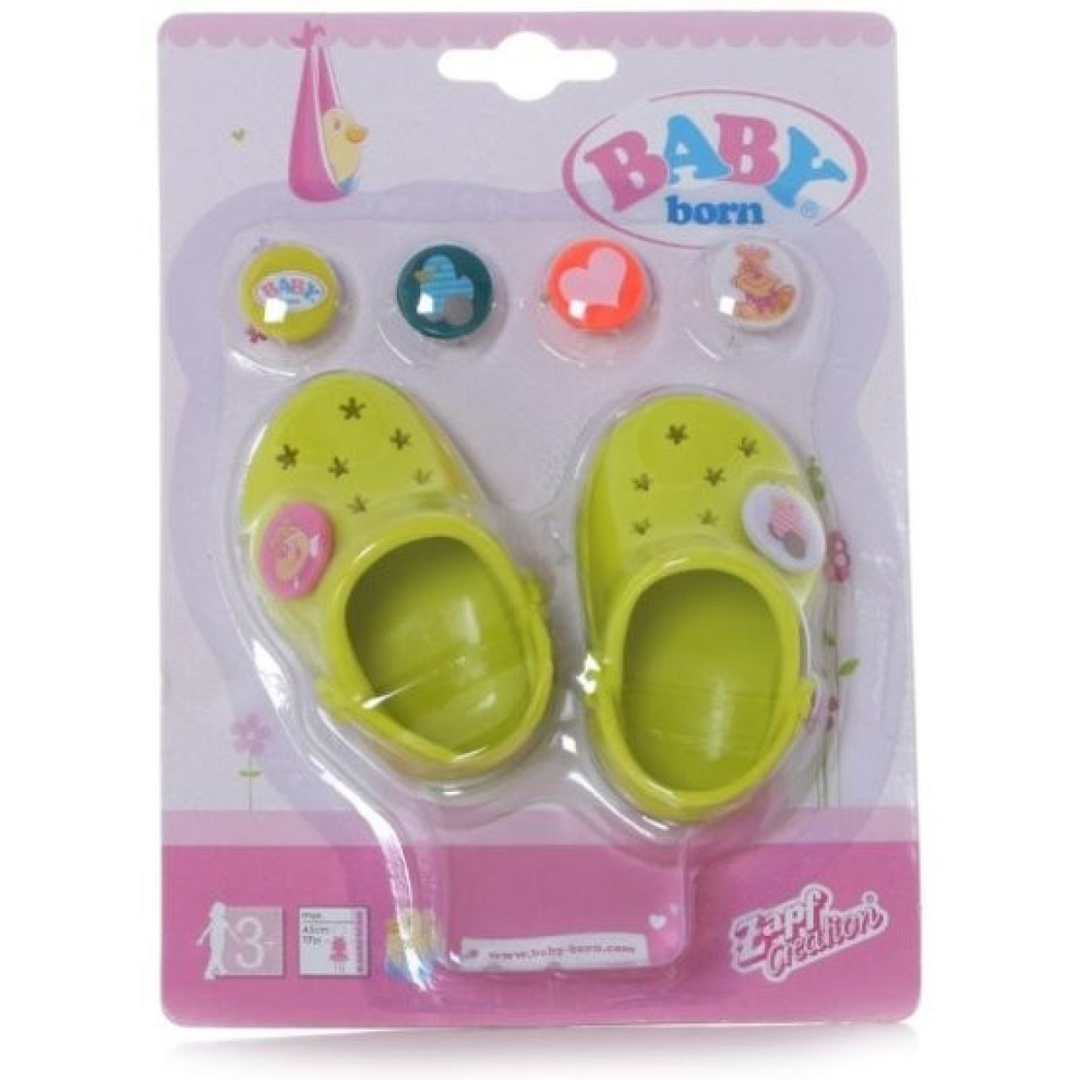 Farebné topánočky, ktoré môžu slúžiť ako sandálky, papučky, alebo ako topánočky do mesta aj na záhradu, v štýle obľúbenej obuvi "crocs". V balení nájdete šesť rôznych ozdôb, ktoré sa dajú ľahko pripevniť k topánočke, a tak sa dajú zladiť podľa nálady alebo podľa oblečenia bábiky Baby Born.
