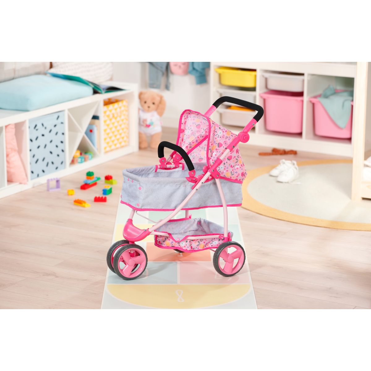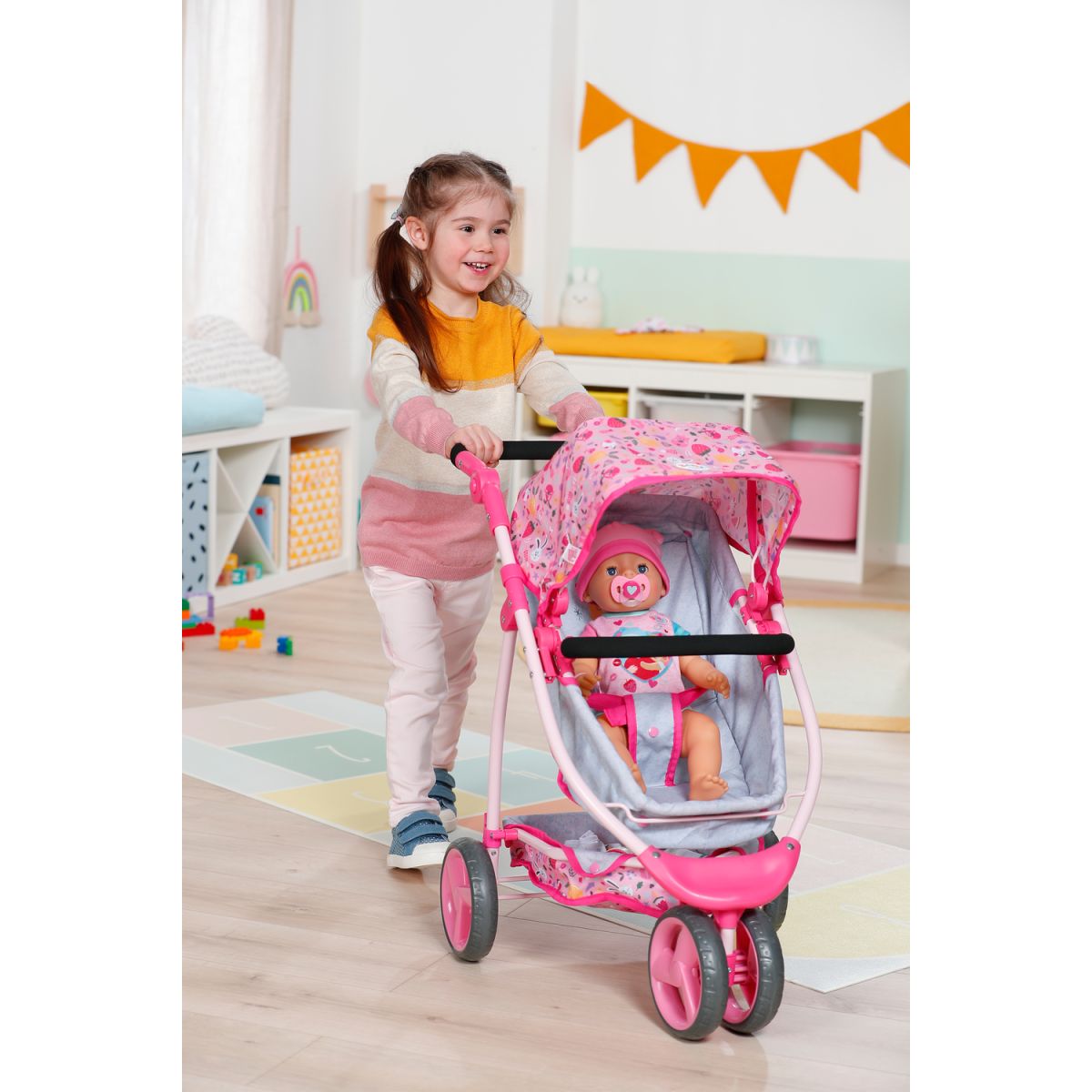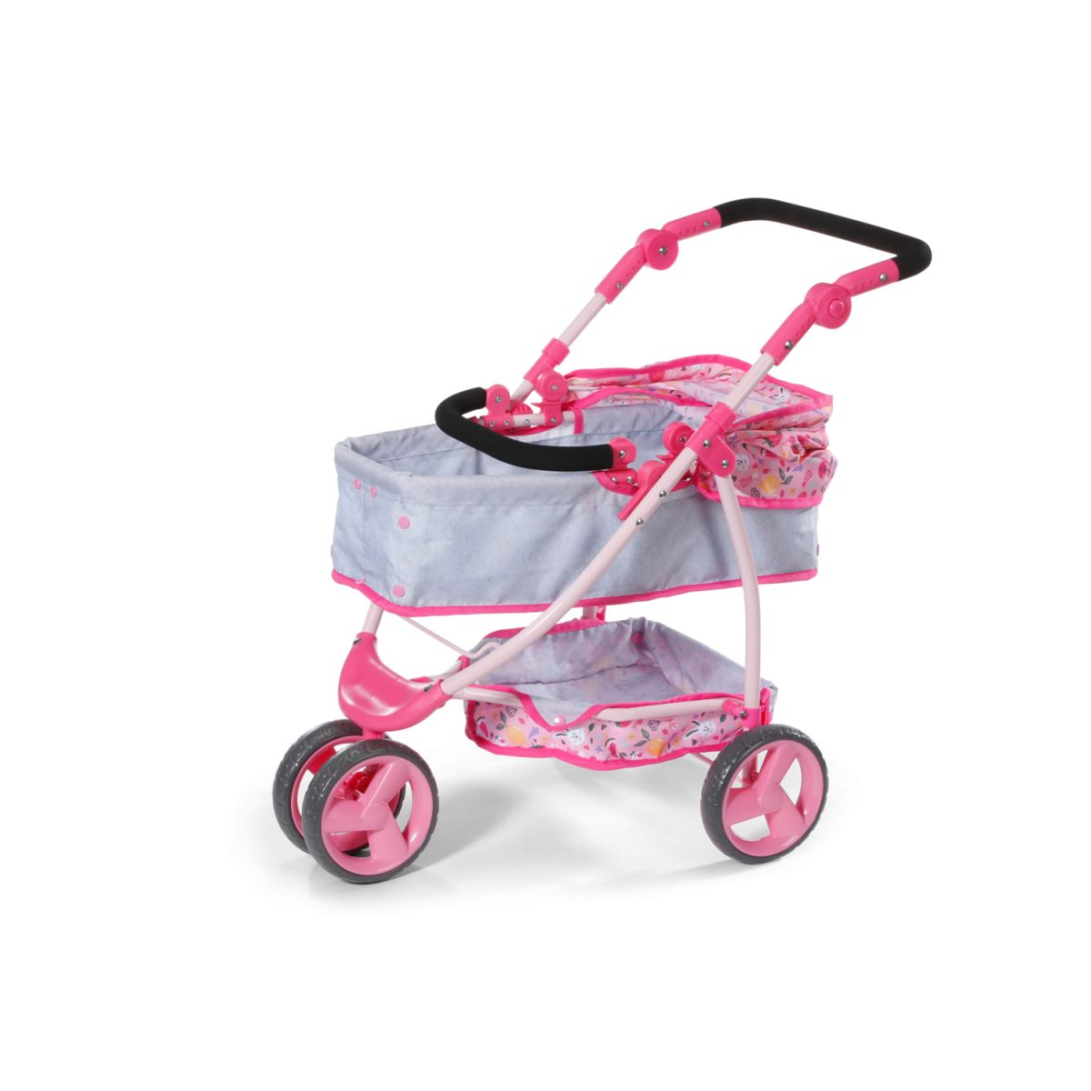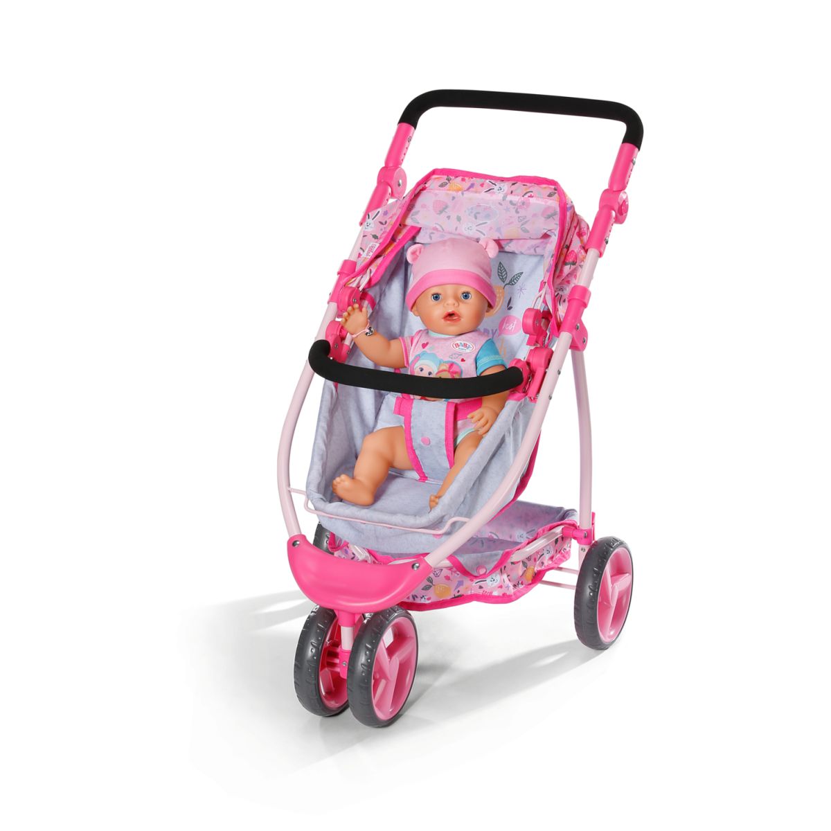 BABY born Kombinovaný kočík je ako dva v jednom – hlboký aj športový. Stačí sklopiť vaničku a bábika razom namiesto ležania sedí a môže pozorovať svet okolo seba. Polohovateľná strieška chráni pred slnkom a do veľkého košíka sa zmestí ako plyšový kamarát, tak všetky poklady z prechádzky. Trojkolesový dizajn robí z kočíka ľahkého spoločníka, ktorý zvládne každú trasu. Nastaviteľné madlo zaistí, že si jazdu užijú deti rôzneho veku. Po hraní sa kočík jednoducho zloží, takže doma zostane dostatok miesta aj na ďalšie hry. Tento kočík je ideálny parťák pre malé mamičky a oteckov, ktorí chcú svojej bábike dopriať pohodlie aj štýl.