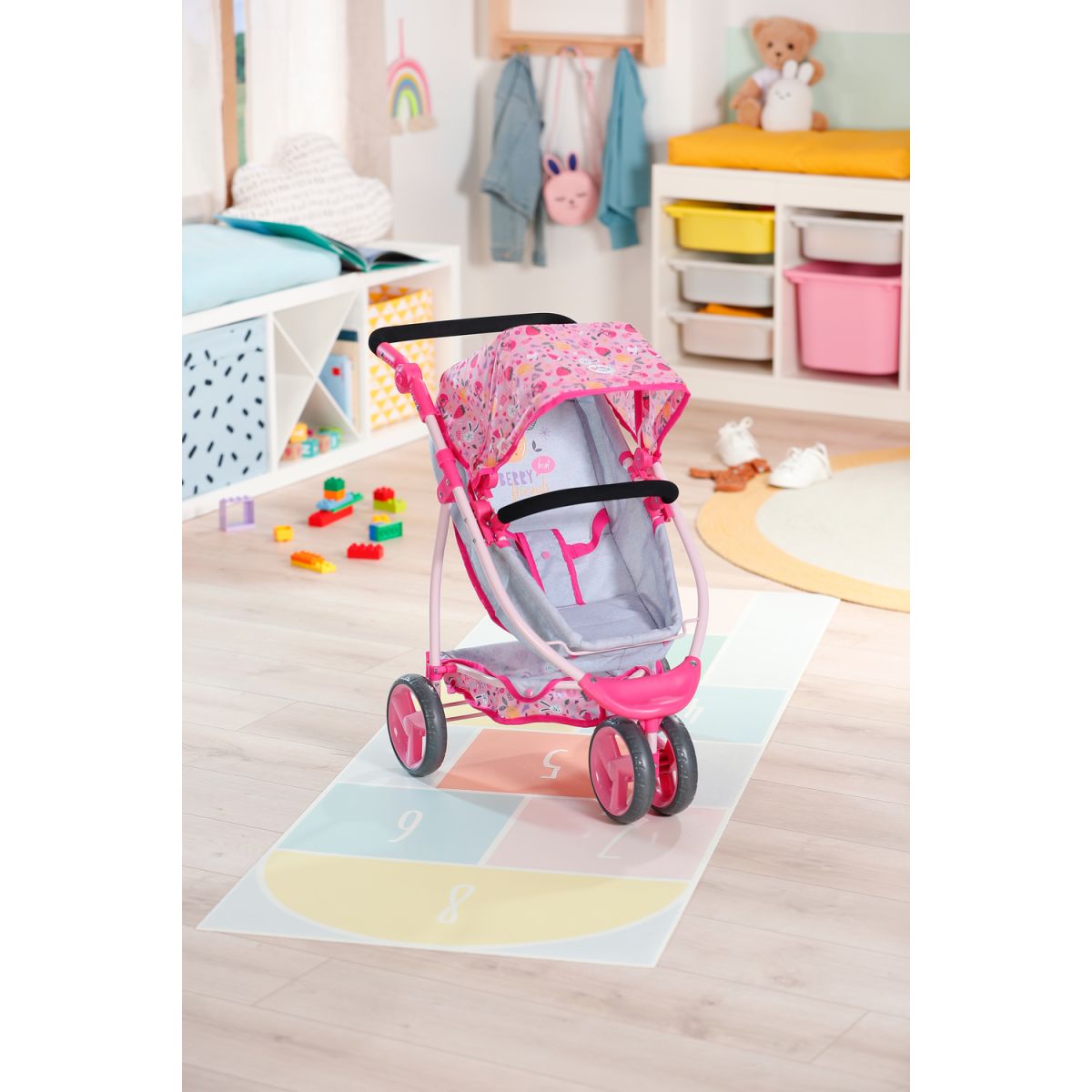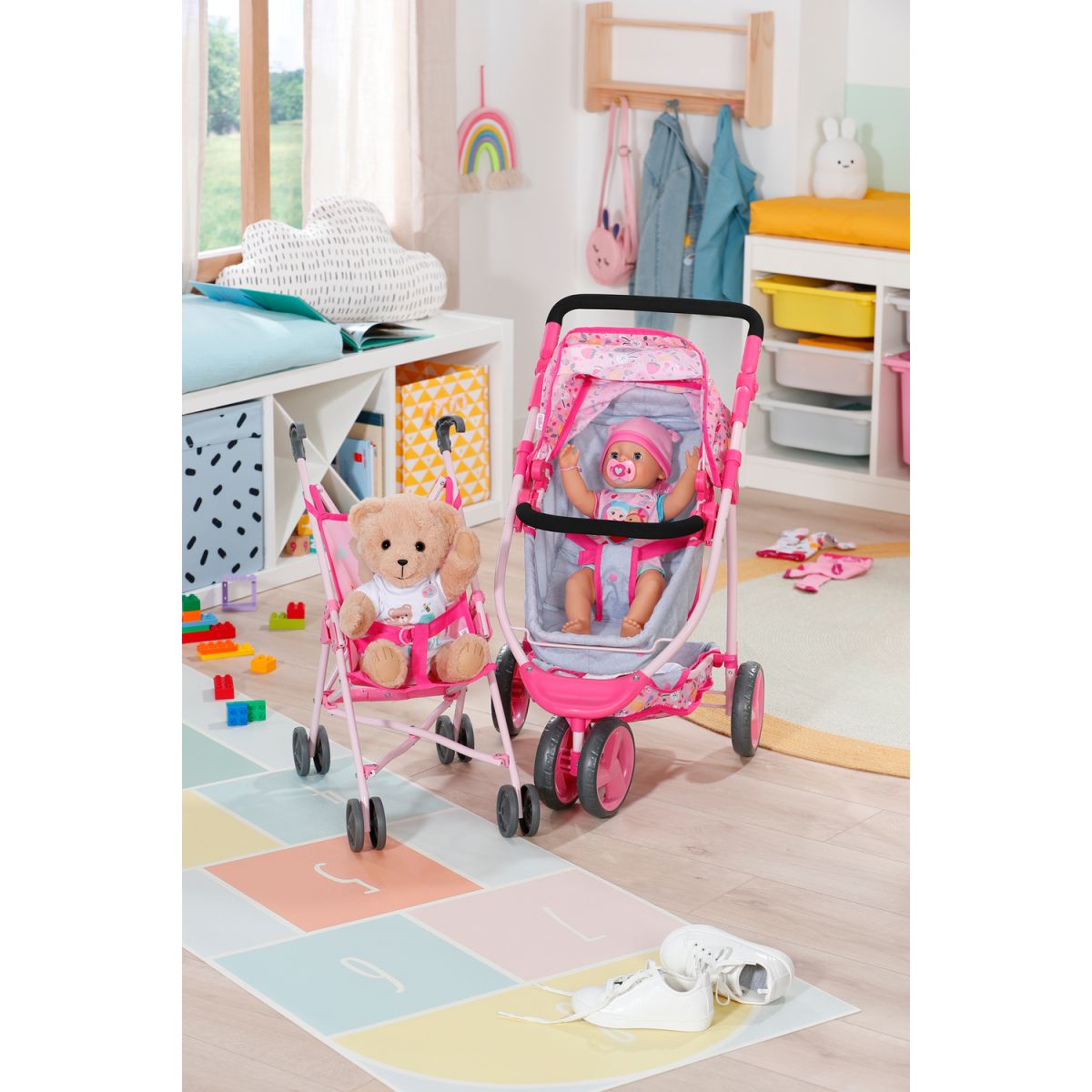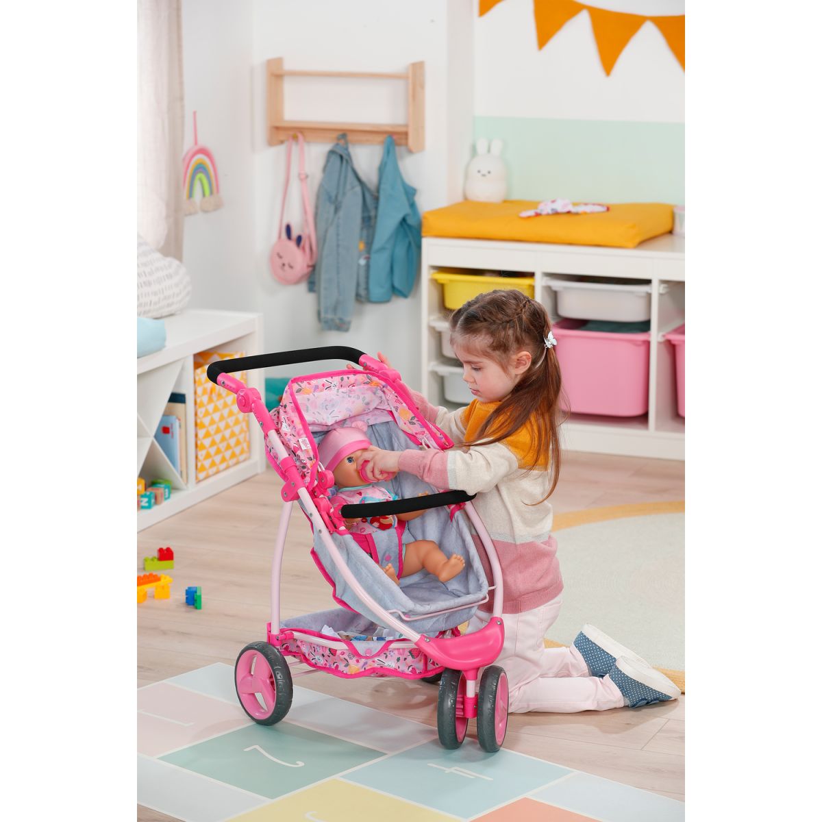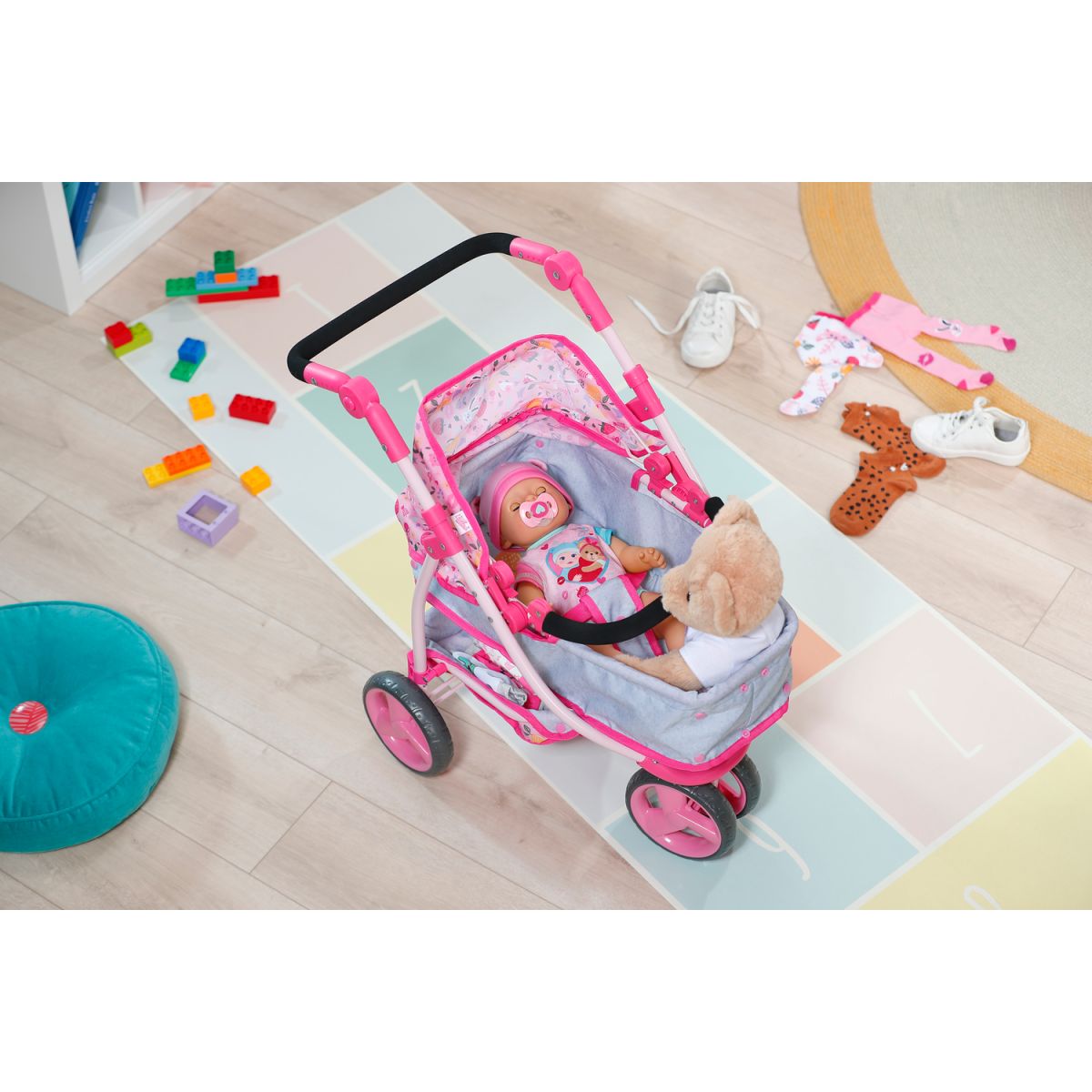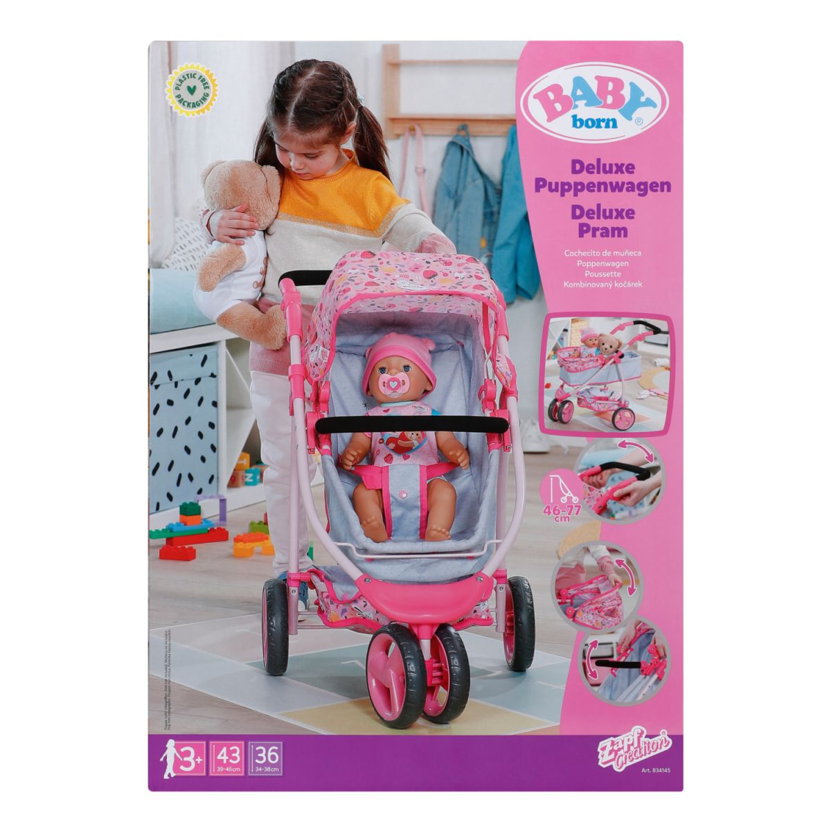 BABY born Kombinovaný kočík je ako dva v jednom – hlboký aj športový. Stačí sklopiť vaničku a bábika razom namiesto ležania sedí a môže pozorovať svet okolo seba. Polohovateľná strieška chráni pred slnkom a do veľkého košíka sa zmestí ako plyšový kamarát, tak všetky poklady z prechádzky. Trojkolesový dizajn robí z kočíka ľahkého spoločníka, ktorý zvládne každú trasu. Nastaviteľné madlo zaistí, že si jazdu užijú deti rôzneho veku. Po hraní sa kočík jednoducho zloží, takže doma zostane dostatok miesta aj na ďalšie hry. Tento kočík je ideálny parťák pre malé mamičky a oteckov, ktorí chcú svojej bábike dopriať pohodlie aj štýl.