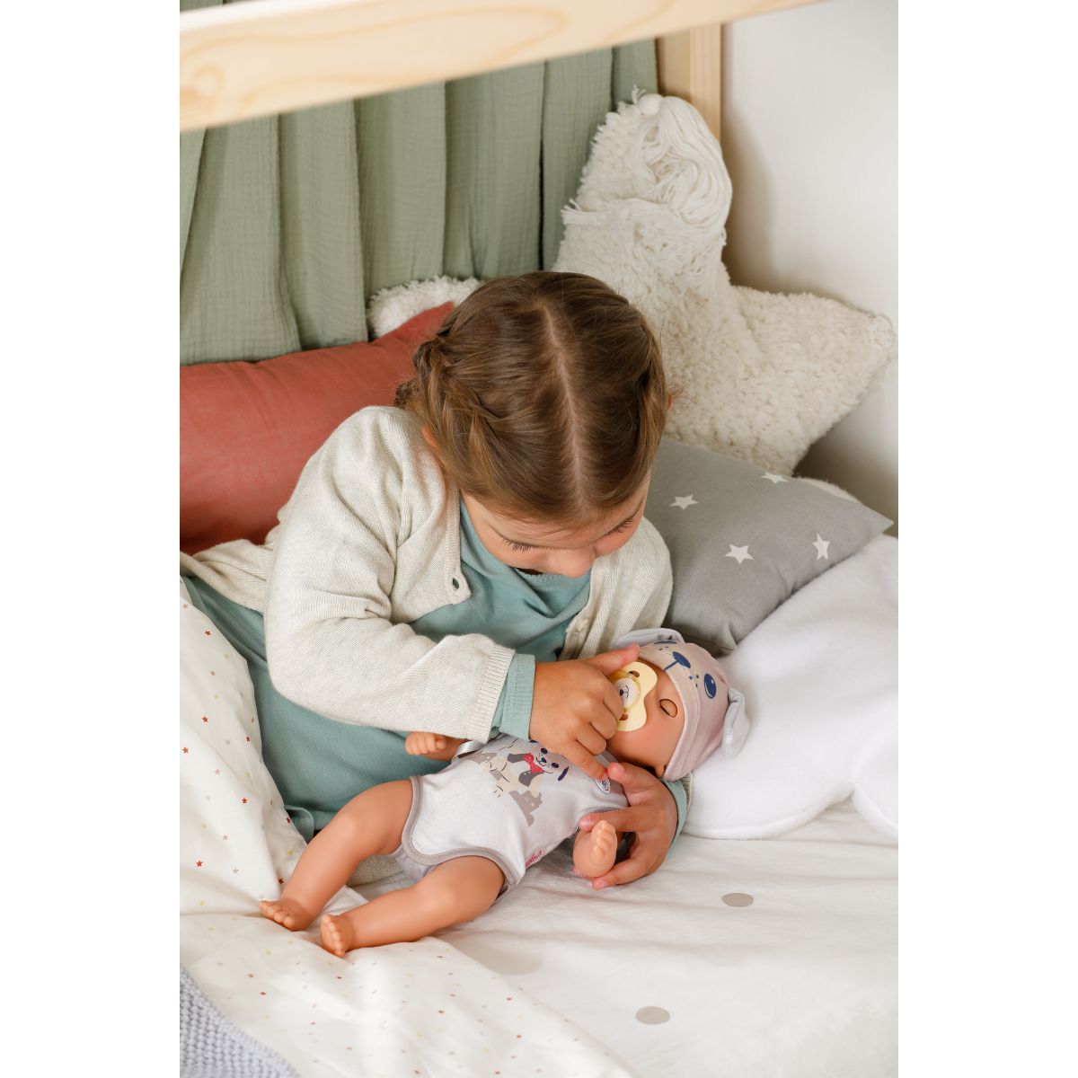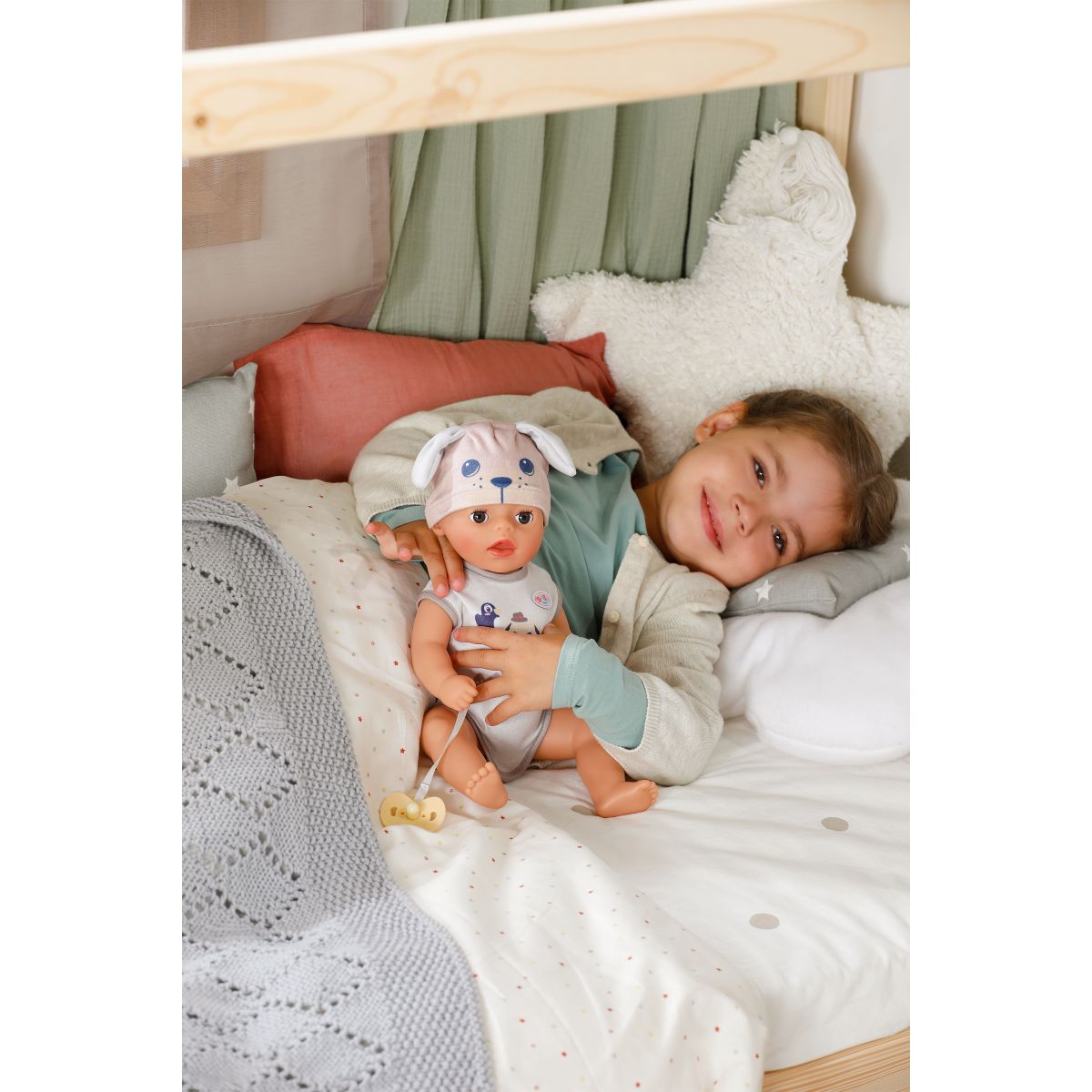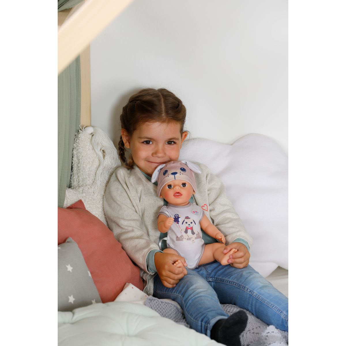 Keď dostane svoj cumlík so psíkom, kúzelne otvára a zatvára oči ako skutočné bábätko. Pohyblivé ruky, nohy a otočná hlava umožňujú ľahké obliekanie bábiky a plienka sa pri kontakte s vodou zafarbí na žlté srdiečko – milý detail pre realistickú hru.