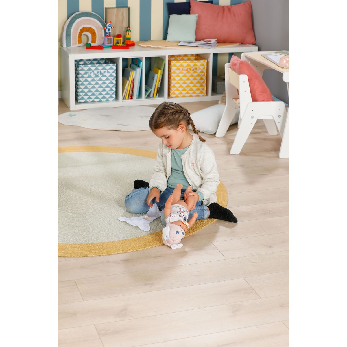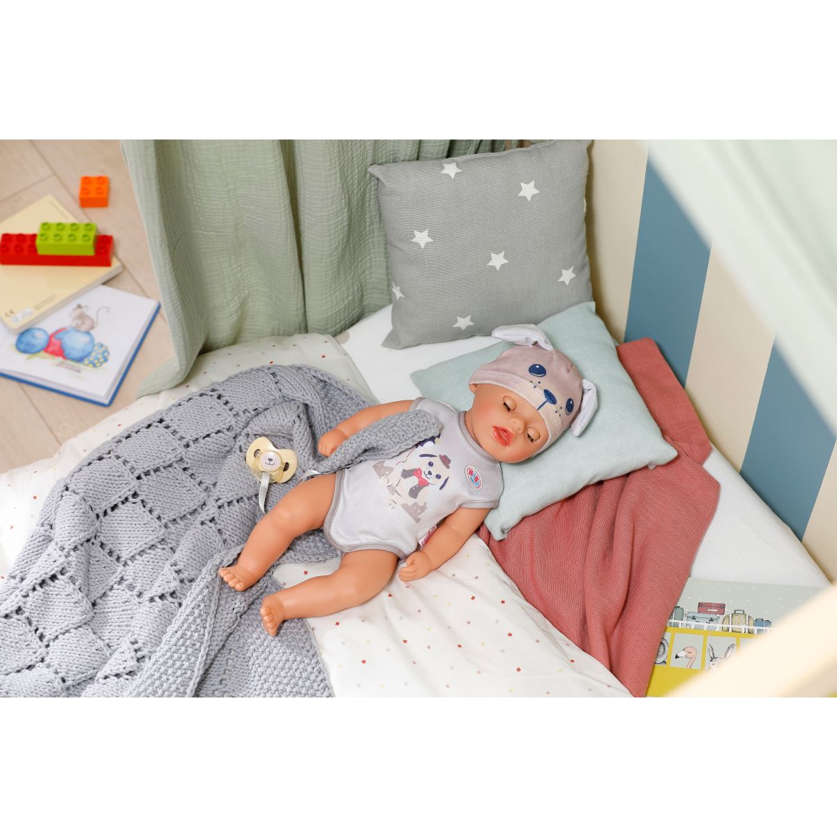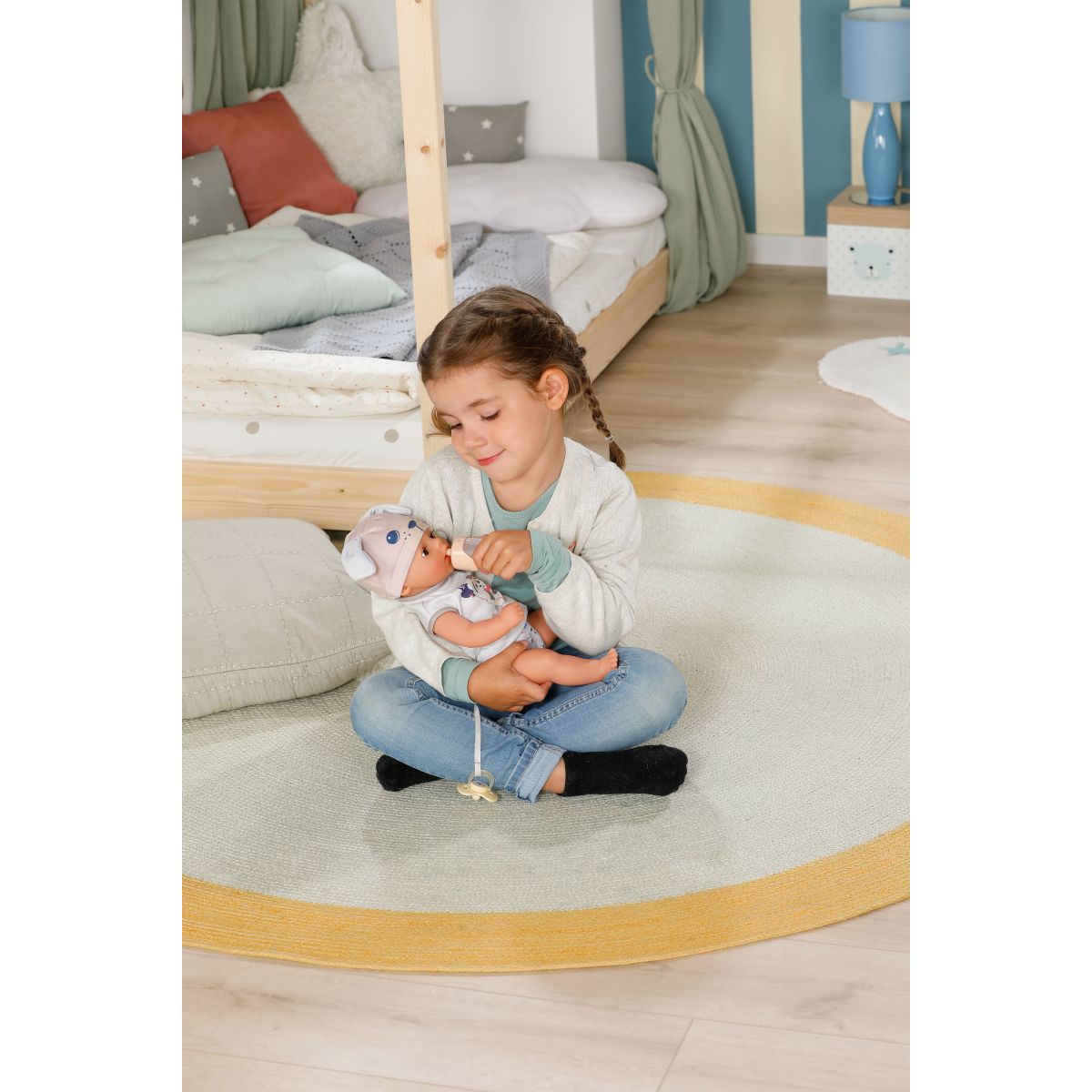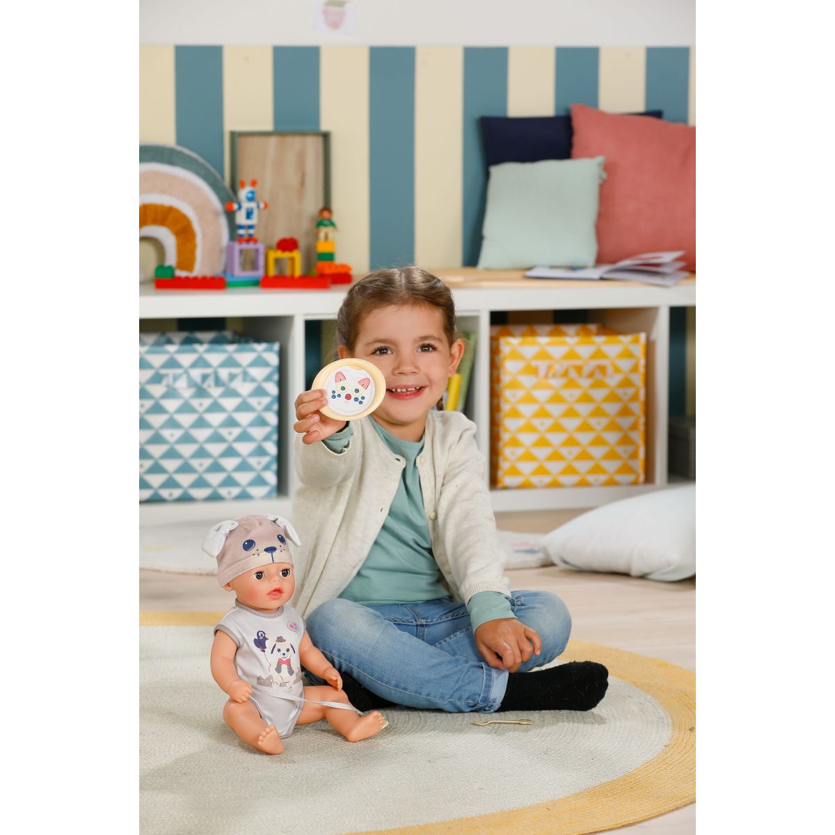 Keď dostane svoj cumlík so psíkom, kúzelne otvára a zatvára oči ako skutočné bábätko. Pohyblivé ruky, nohy a otočná hlava umožňujú ľahké obliekanie bábiky a plienka sa pri kontakte s vodou zafarbí na žlté srdiečko – milý detail pre realistickú hru.