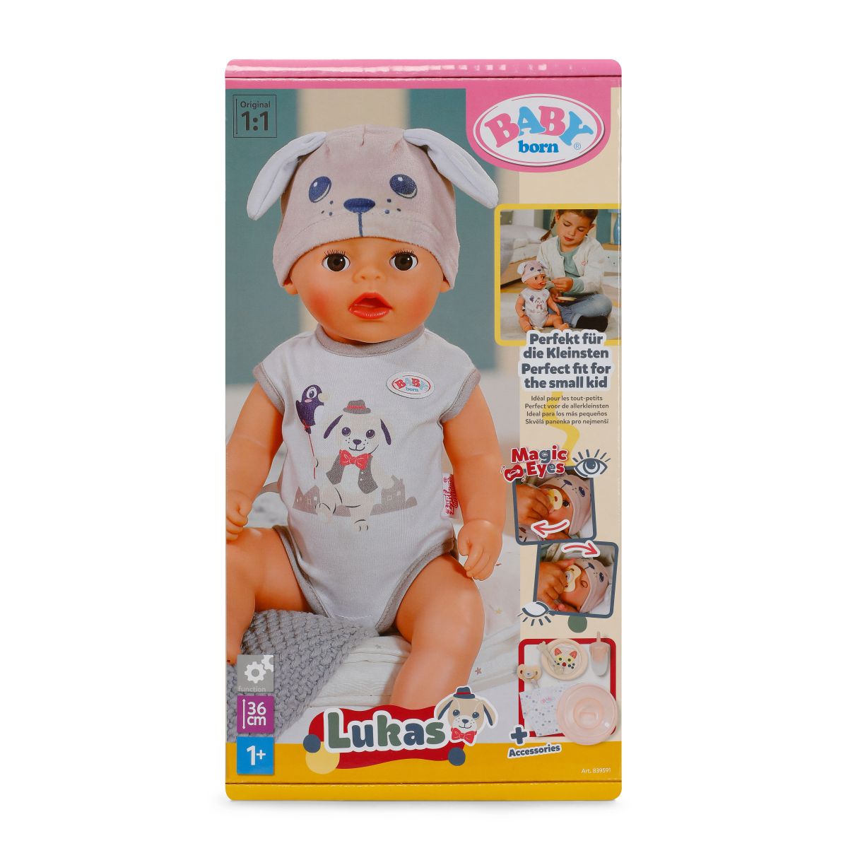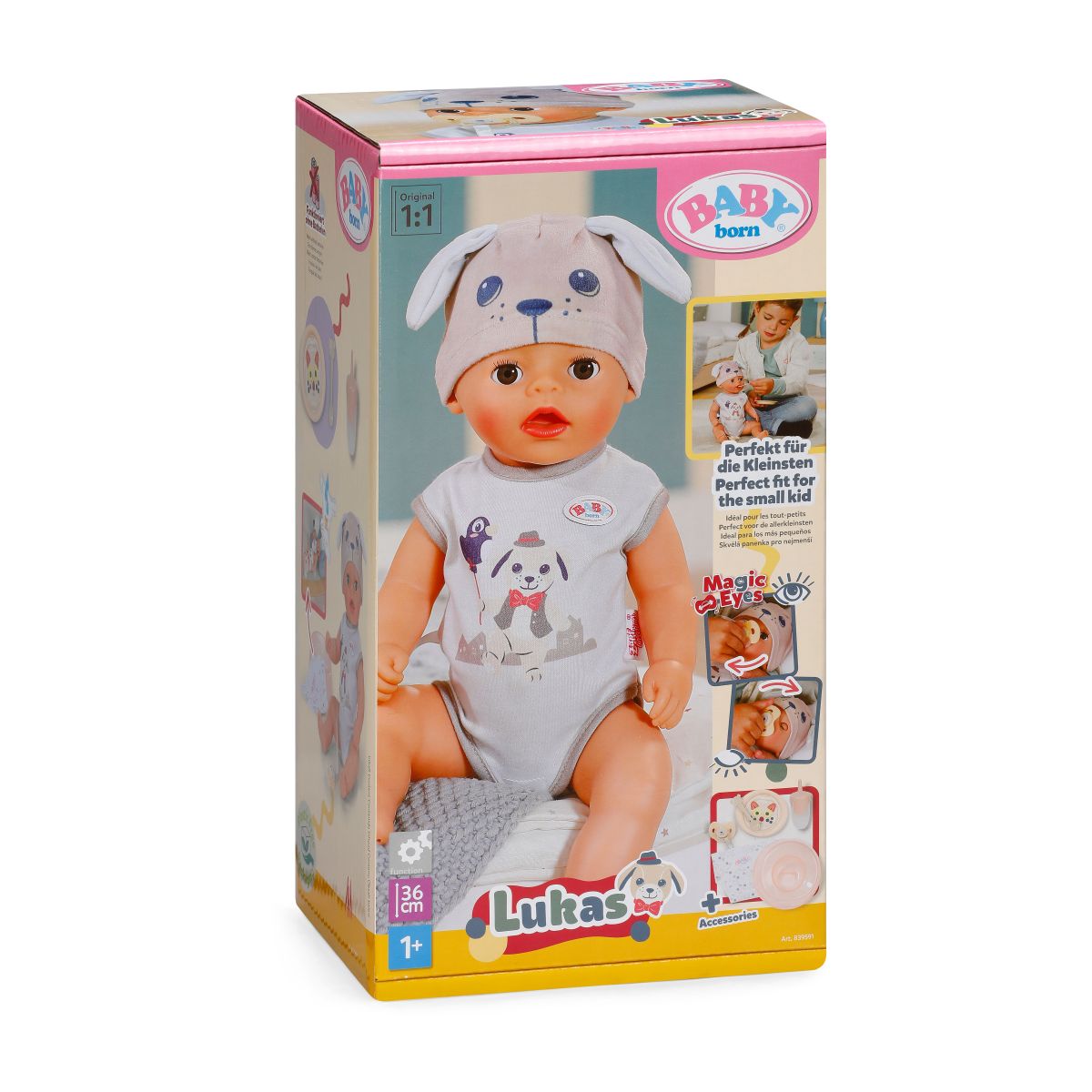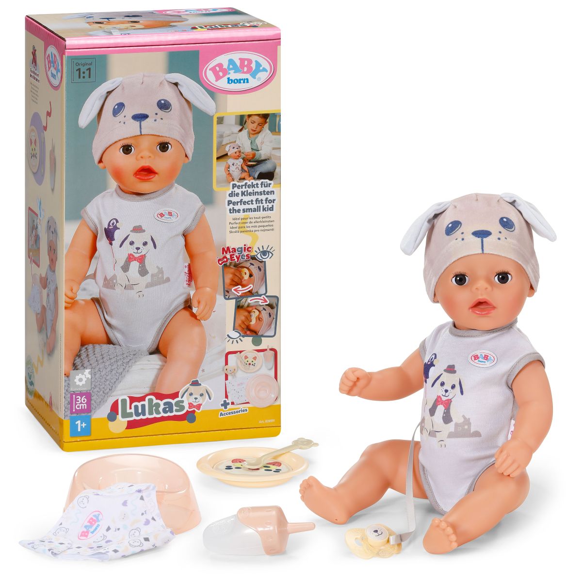 BABY born Lukas Pejsek je ideálna prvá bábika pre deti od 1 roka vďaka svojej veľkosti 36 cm a jednoduchým funkciám ako pitie z fľaštičky či močenie do látkovej plienky.