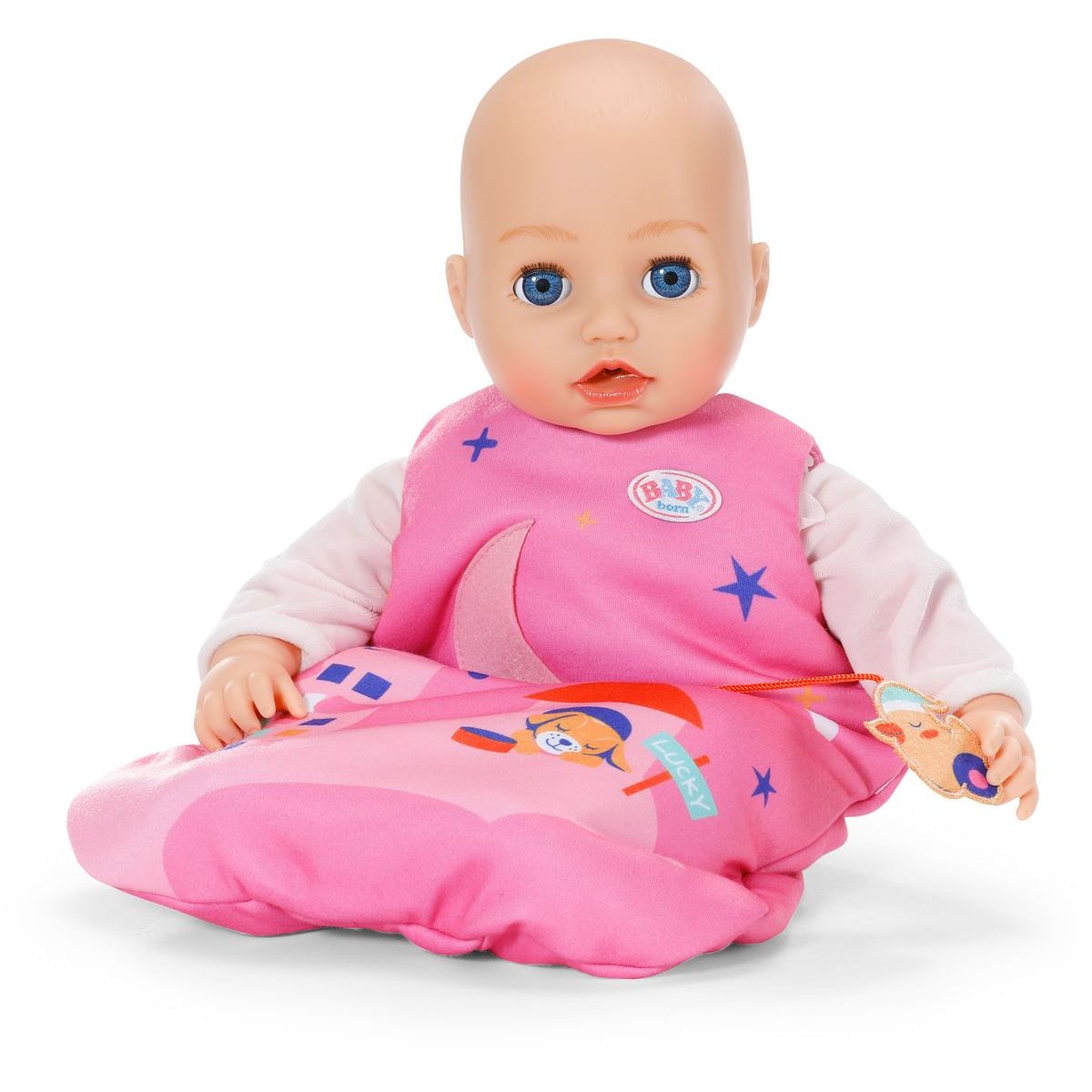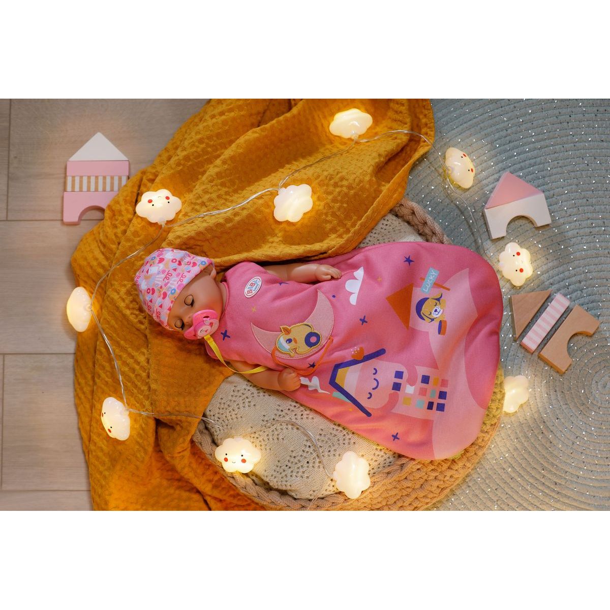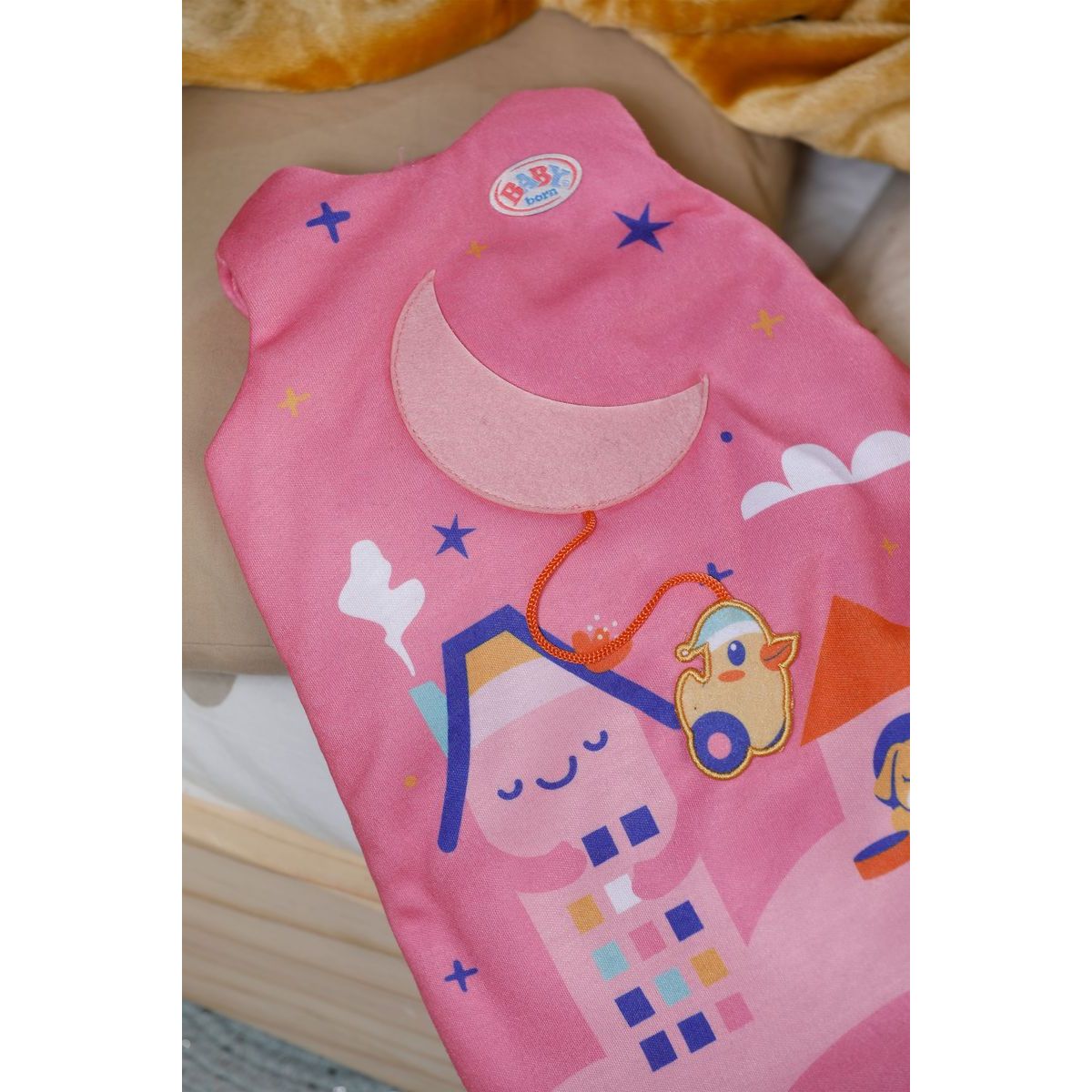Pripraviť, pozor, dobrú noc! S týmto kúzelným spacím vakom sa rituál ukladania na spánok stane najobľúbenejšou časťou dňa. Spací vak s motívom usmievavého mesiaca obklopí bábiku BABY born do nebeského pohodlia a mäkkosti. Aby sa bábike lepšie zaspávalo, robí jej spoločnosť malá žltá kačička na šnúrke, ktorá na ňu celú noc dohliada.