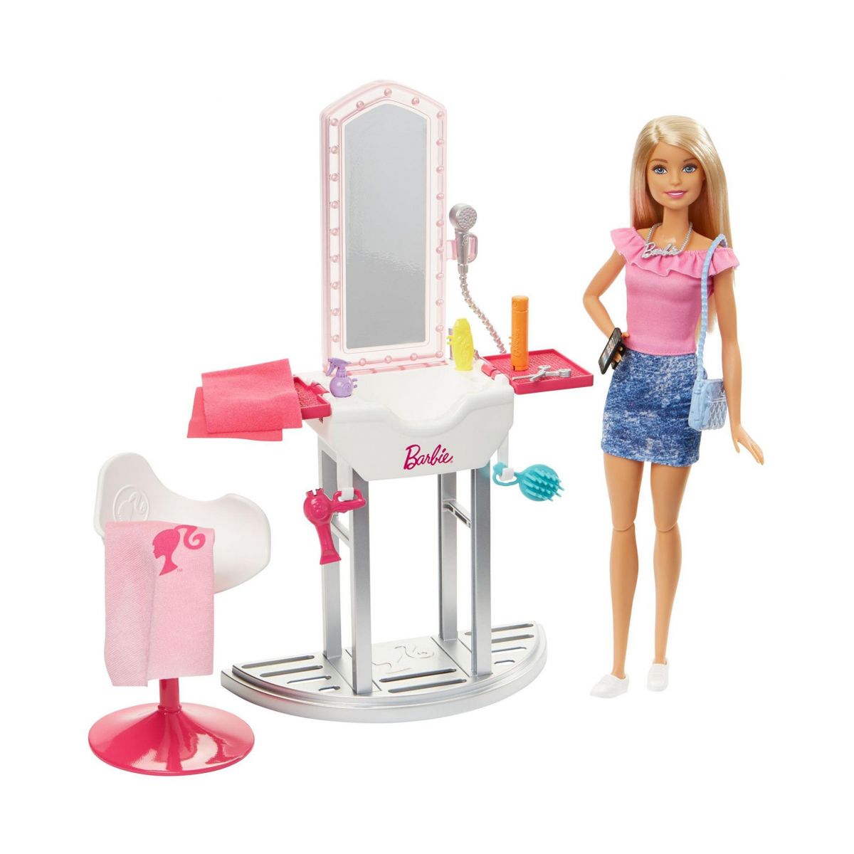 Kadernícky salón, v ktorom si dievčatká môžu hrať s bábikou Barbie na kadeřnicce.