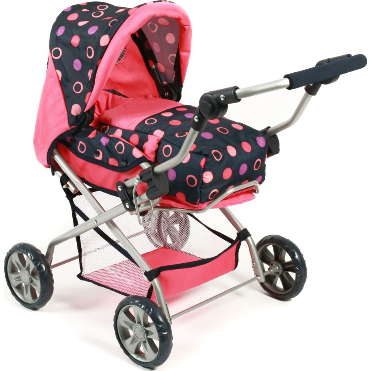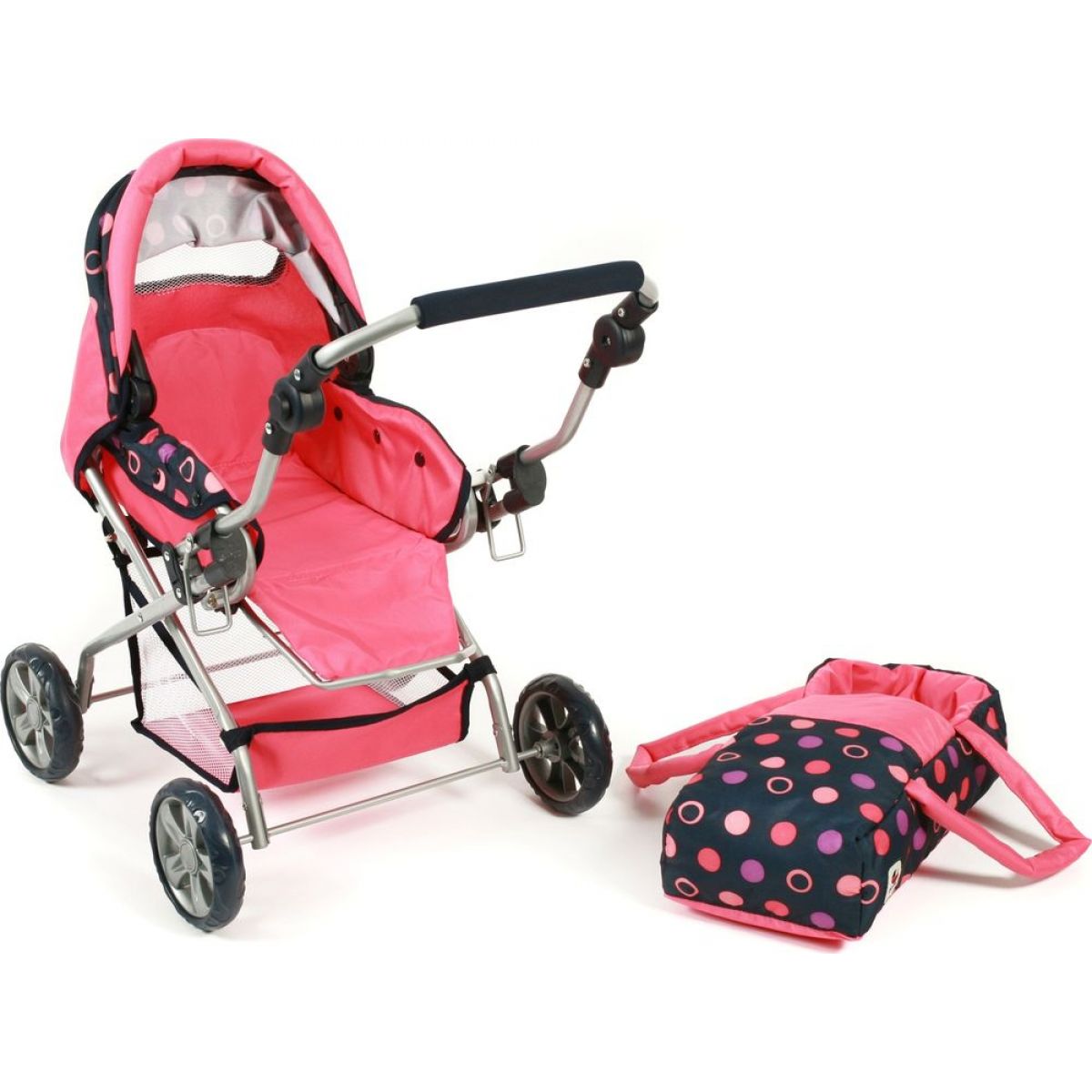 Kombinovaný kočárek pro panenky - trojkombinace. Kočárek má nastavitelnou rukojeť. V polohovatelné boudičce je okénko. Vyjímatelnou tašku, která je součástí kočárku, je možné použít i samostatně jako tašku na panenku. Kočárek má vespod konstrukce košík pro uložení drobností. Vhodné pro panenku do 46 cm.