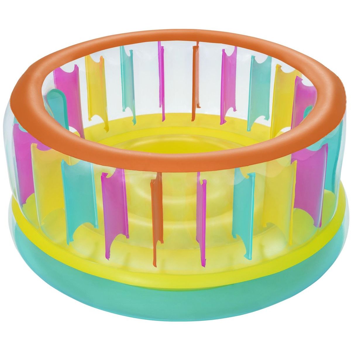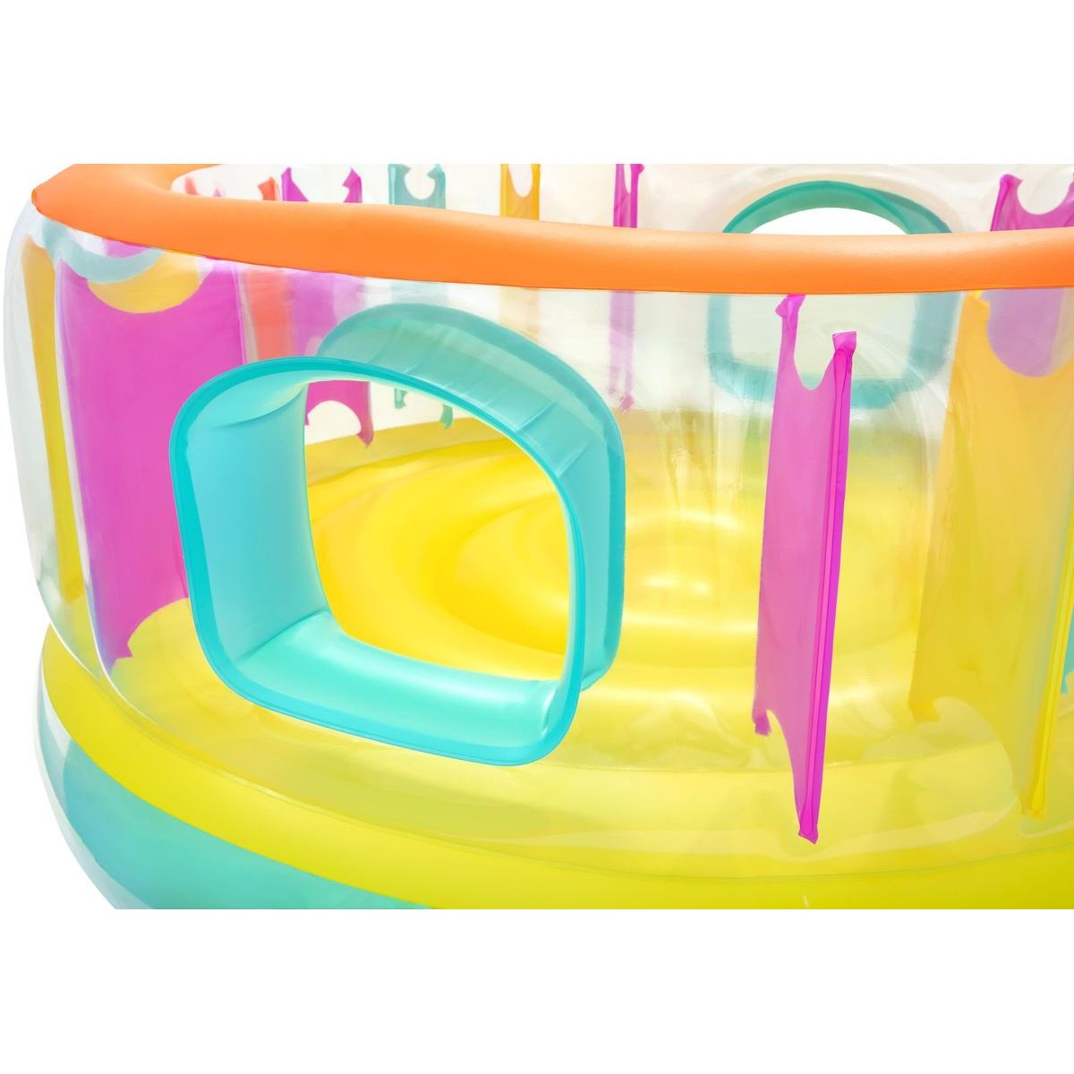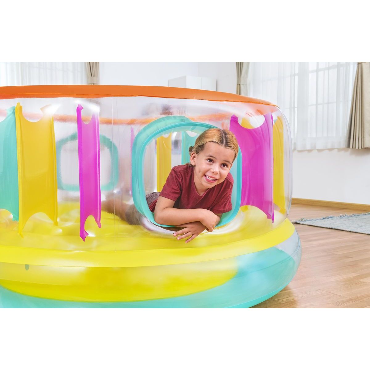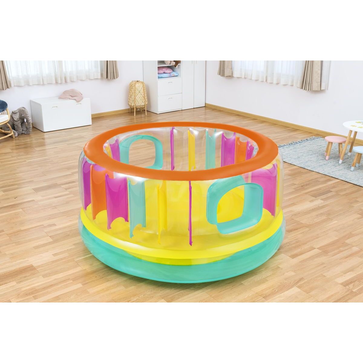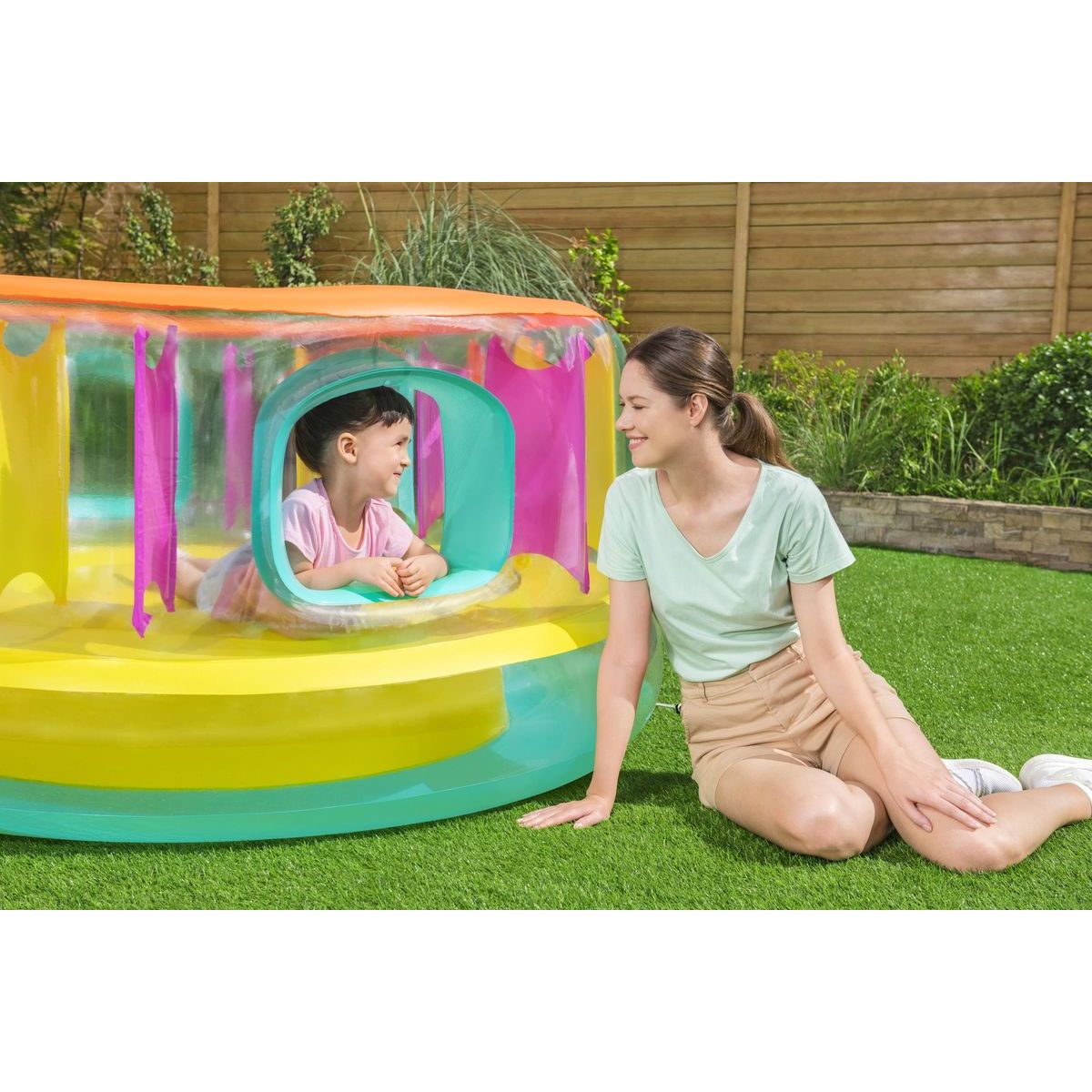 Priehľadné steny s veselými farebnými pruhmi umožňujú jednoduchý dohľad rodičov, zatiaľ čo dva vstupy podporujú samostatnosť pri hre. Nosnosť až 85 kg umožňuje spoločnú zábavu viacerých menších detí. Plastové kolíky zabezpečia lepšiu stabilitu pri vonkajšom použití.