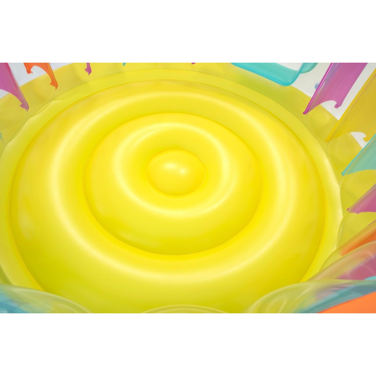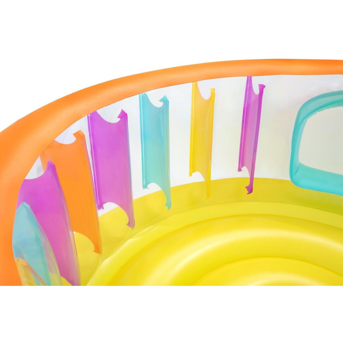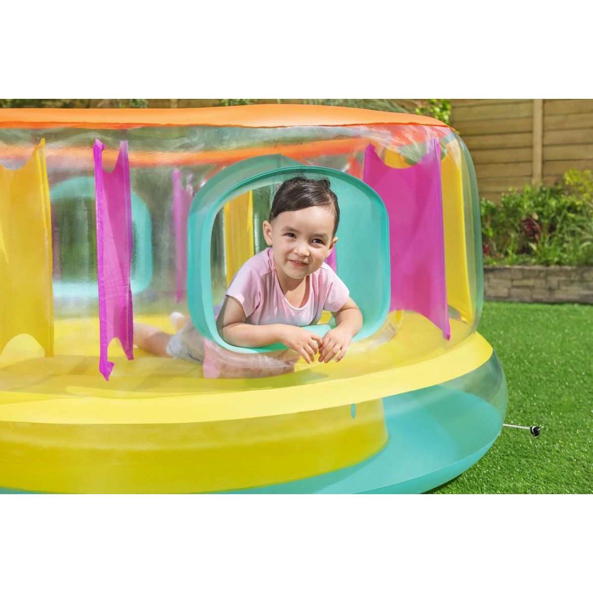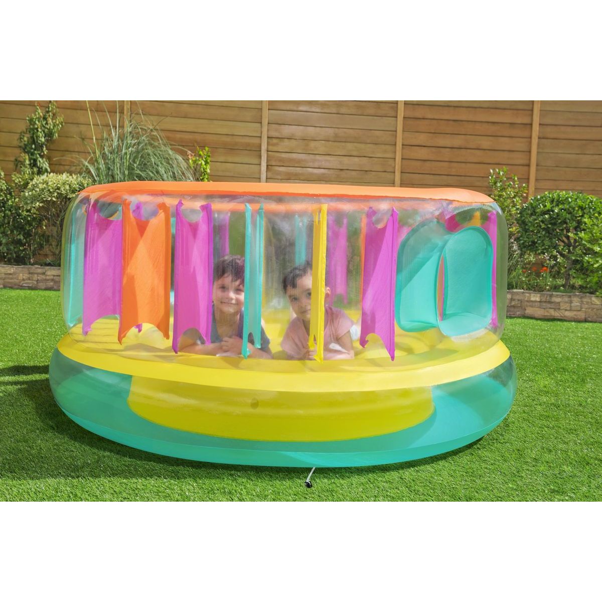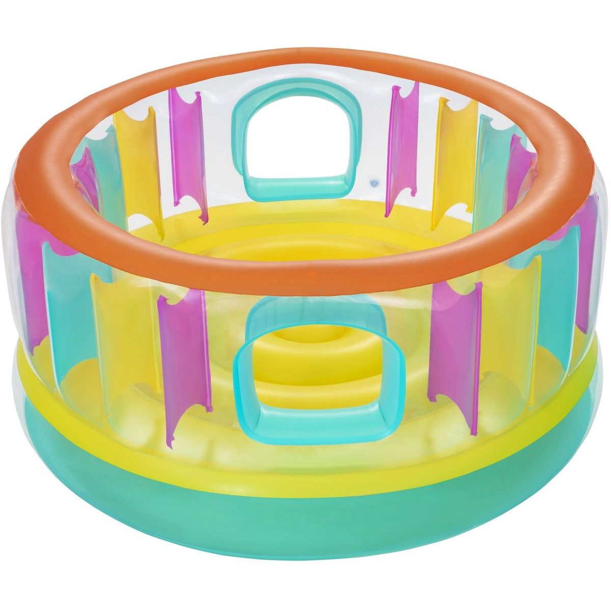 Priehľadné steny s veselými farebnými pruhmi umožňujú jednoduchý dohľad rodičov, zatiaľ čo dva vstupy podporujú samostatnosť pri hre. Nosnosť až 85 kg umožňuje spoločnú zábavu viacerých menších detí. Plastové kolíky zabezpečia lepšiu stabilitu pri vonkajšom použití.