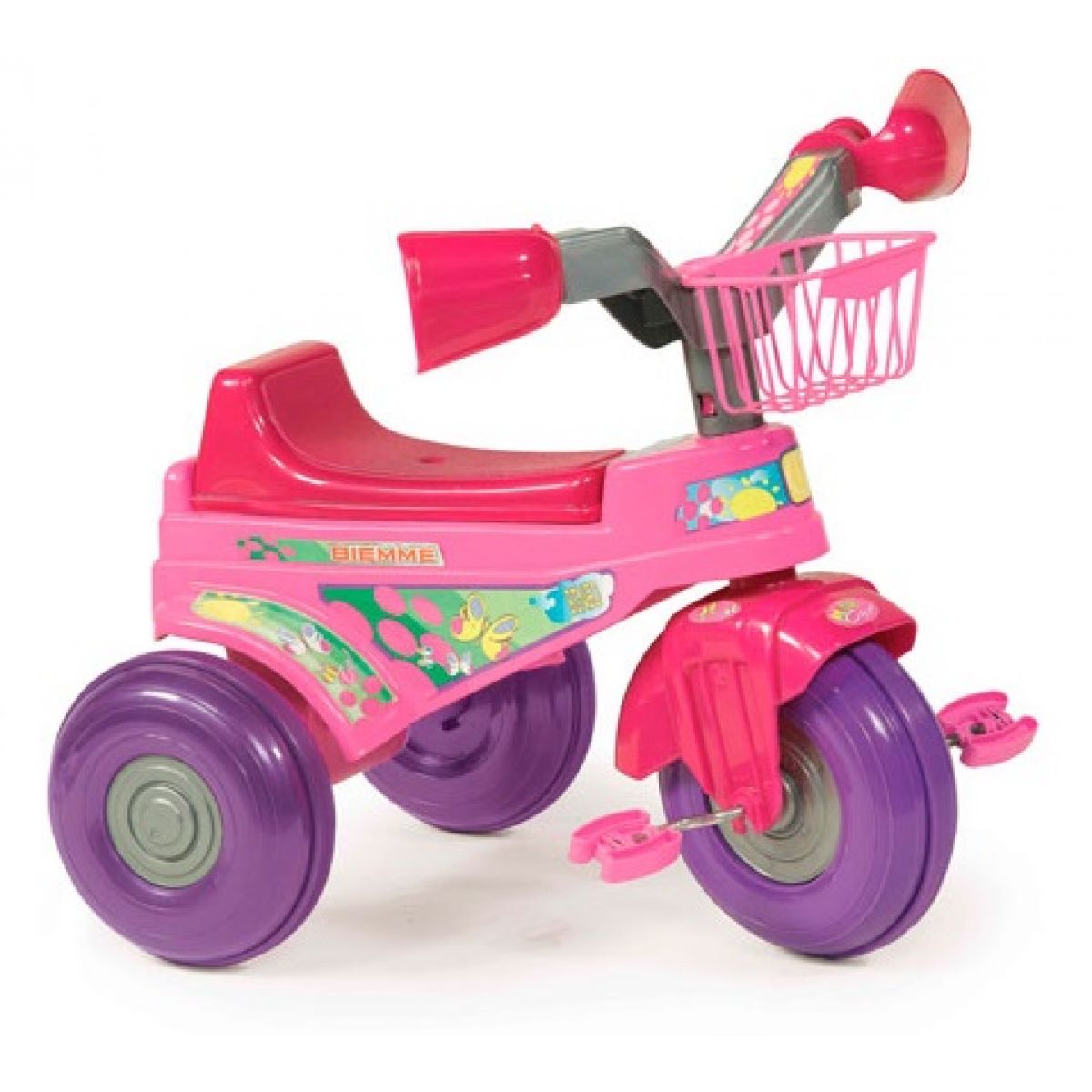 Krásně barevná dětská šlapací tříkolka s košíkem potěší každou malou holčičku.