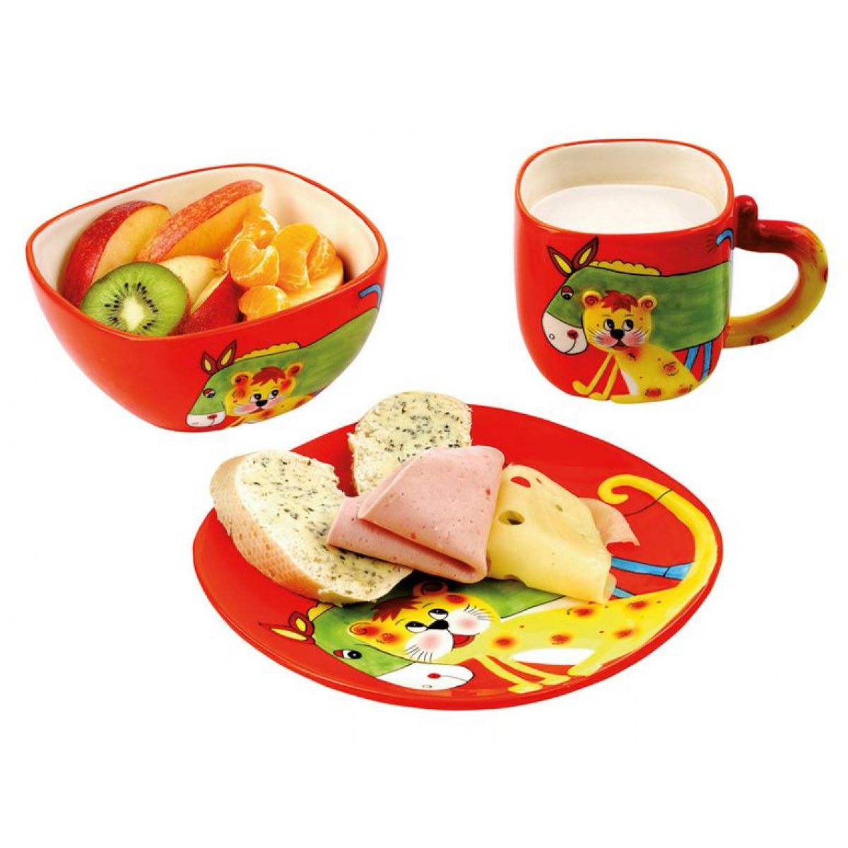 Ćervený talířek, mistička a hrneček s tygrem a koníkem. Pestrobarevné barvy podporují chuť k jídlu, a tak i pro malého neposedu bude jídlo zábavou a činností, na kterou se bude vždy těšit! Vyrobeno z dolomitu.