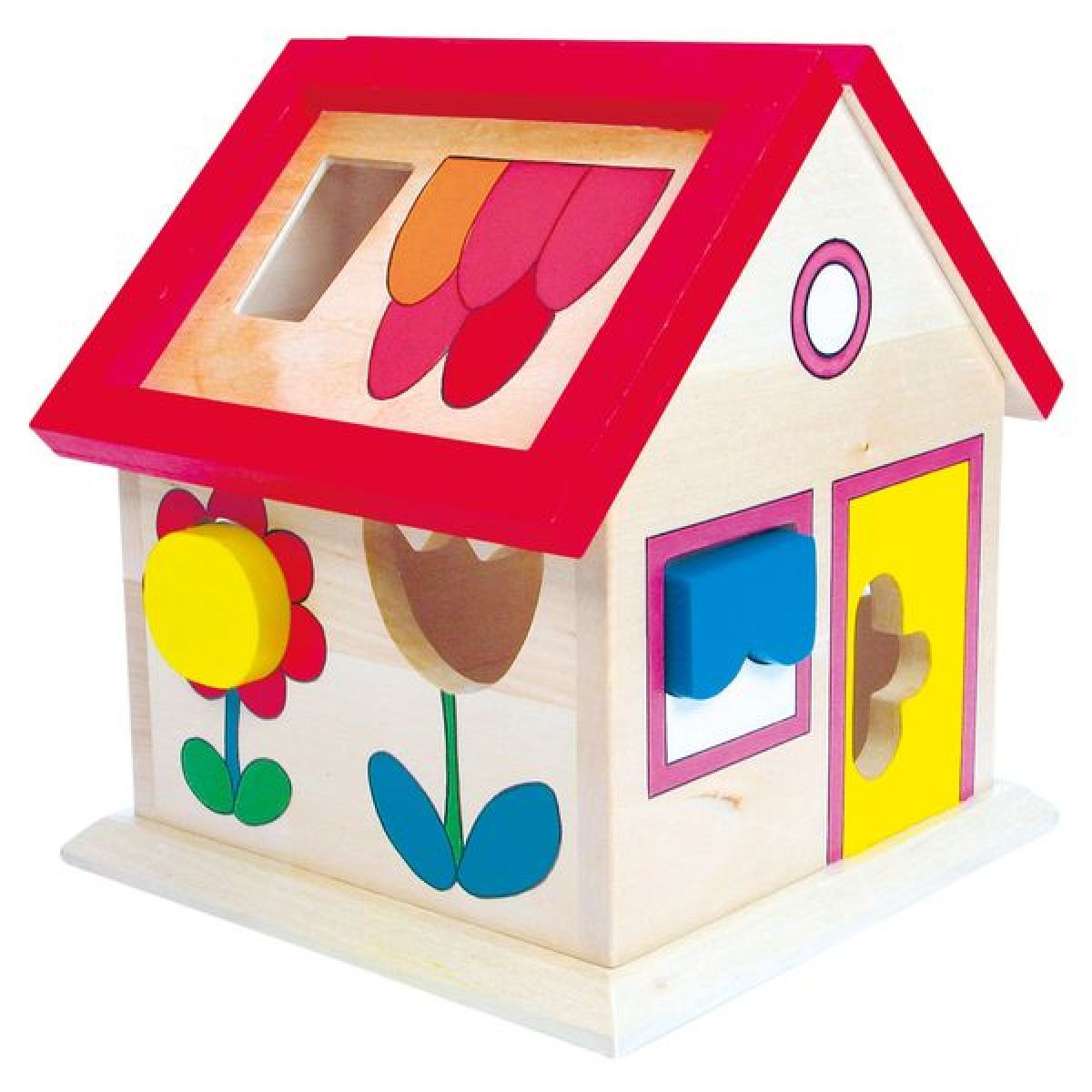 Dřevěná vkládačka ve formě malé barevné chaloupky, se kterou si děti od tří let mohou zkusit přiřadit správné dílky do připravených výřezů.