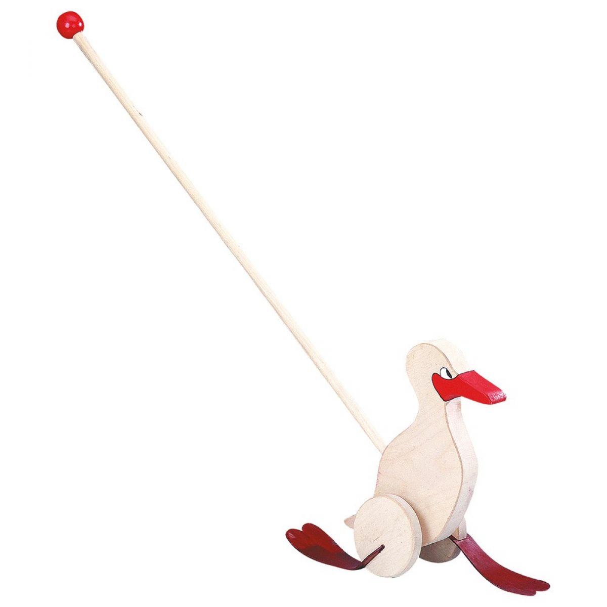 Drevená kačica na tyči, pri pohybe jazdí na kolieskach, na ktorých sú pripevnené plutvy, ktoré sa otáčaním koliesok pohybujú.