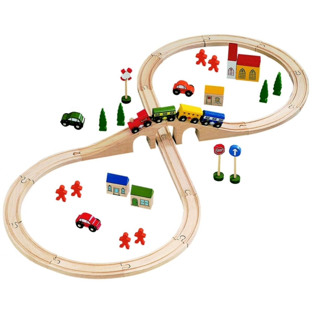 Dřevěná vláčkodráha Bino s mostem a podjezdem. Krásná sada obsahuje nejenom jednotlivé díly železnice, ale také nezbytné vybavení, jako jsou domečky kolem dráhy, vláčky s vagóny na dráhu, ale i stromy a postavičky, značky a autíčka. Jednotlivé díly i celá sada je kompatibilní s ostatními dřevěnými vláčkodráhami Bino.