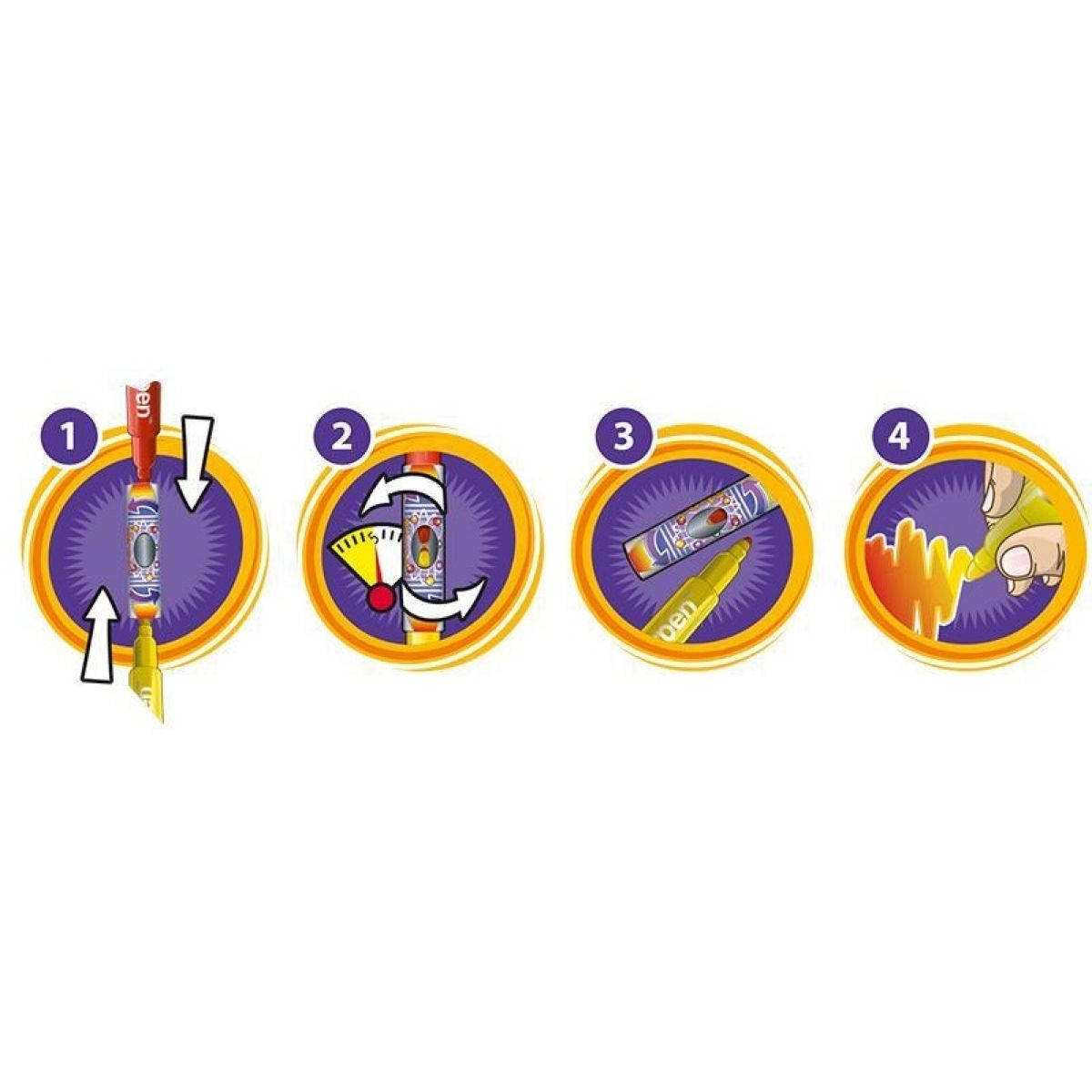 Sada foukacích fixů se zajímavou fixírkou, která podporuje kreativní nápady, použitelné v rámci vytváření dopisů, plakátů, pohlednic, všude tam kde chtějí děti připoutat pozornost tímto výrazovým prostředkem. Mohou také využít šablon zvířat, jako rybka, ptáci, méďa, nebo mořský koník.