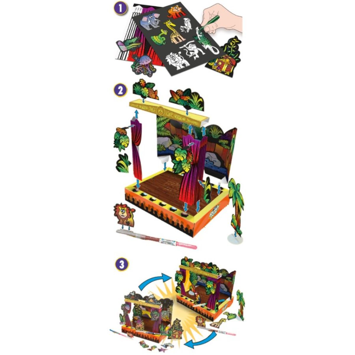 Skládací divadélko včetně kulis a loutek - jen je potřeba nejprve divadlo sestavit a namalovat! Barvení pomocí přiložených míchacích fixů (16 ks). Dále je součástí balení 8 míchacích komůrek, divadelní jeviště s oponou, 2 oboustranné scény (mopře a džungle), 16 ks postaviček, 4 držáky rekvizit, 16 ks rekvizit, 21 ks samolepek, návod.