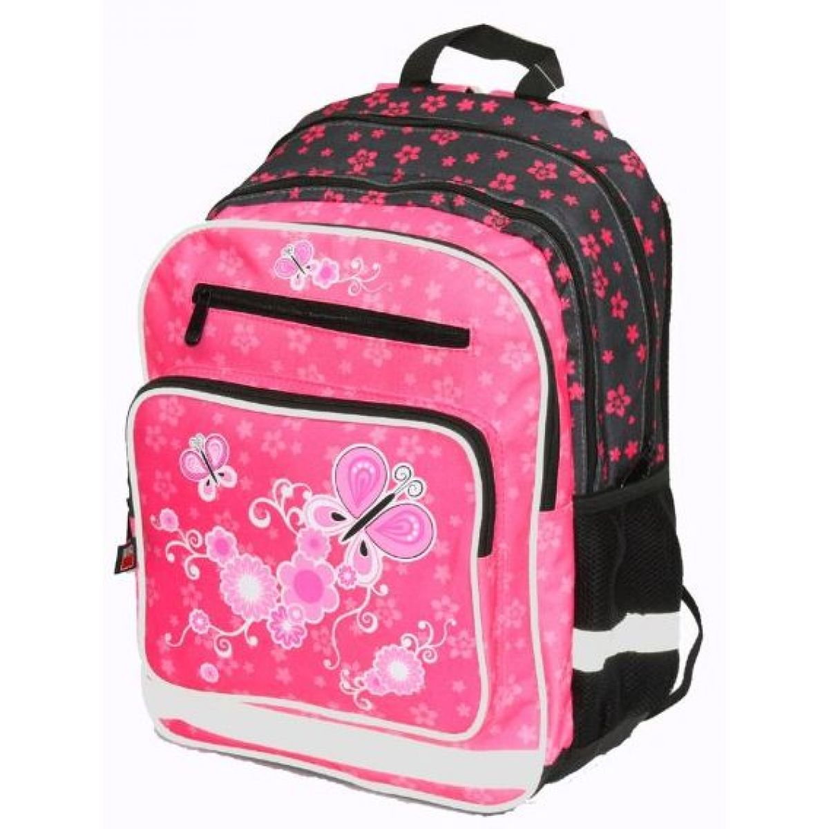 Školní tříkomorový batoh s motivem Motýlka vhodný pro 1. stupeň základní školy. Prostřední a přední komora jsou stejně veliké a jsou doplněny o organizér a praktickou karabinu na klíče. Nejprostornější zadní komora je vhodná na učebnice a sešity. Přední kapsu lze použít na penál nebo svačinový box.