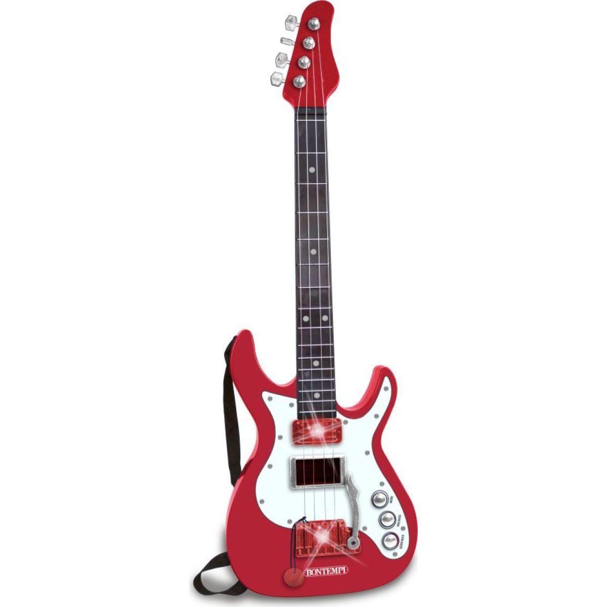 S touto gitarou si deti môžu zahrať na 4 kovových strunách a vďaka klepaniu prstami na akordy vytvoriť vlastné melódie. Gitara ponúka 3 režimy, 12 rokových demo zvukov a 13 melódií. Svetelné efekty a ramenný popruh zvýšia zábavu pri hraní!