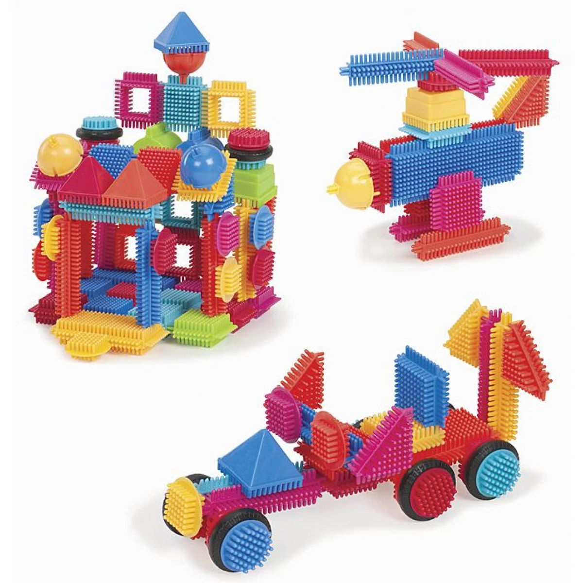Barevná stavebnice ze 112 ježatých dílků čeká na děti od 2 let. Holky a kluci si mohou díky bodlinkám jednotlivých částí snadno vystavět domek, auto, vrtulník a mnoho dalších objektů. Pro autíčka jsou připravena kolečka.