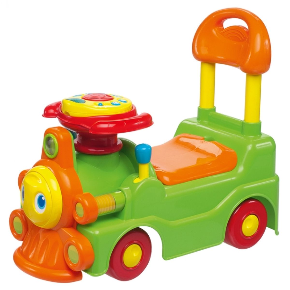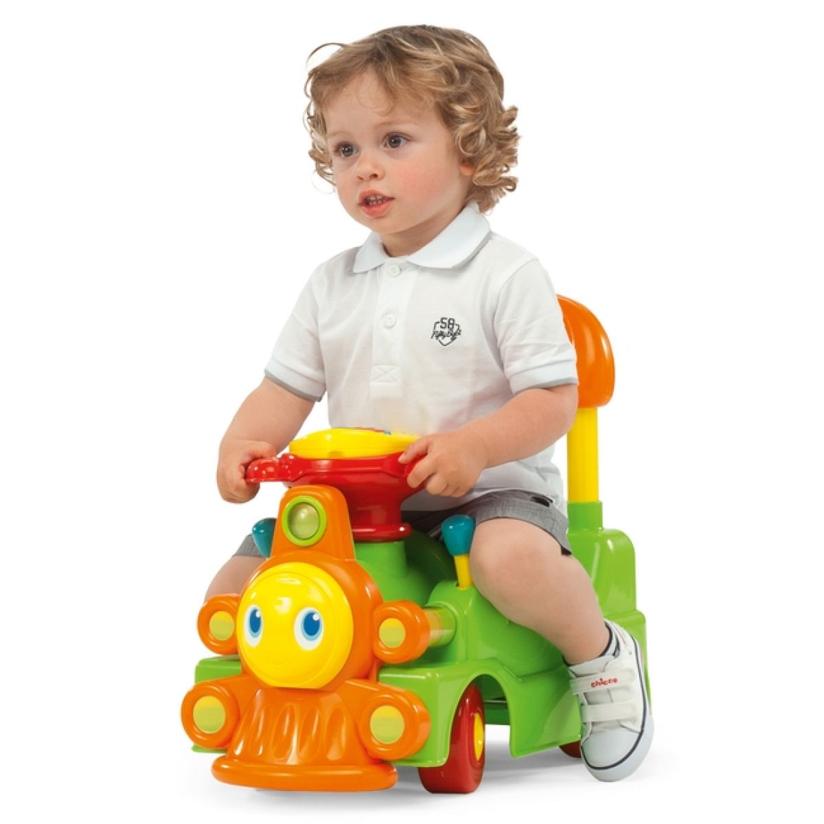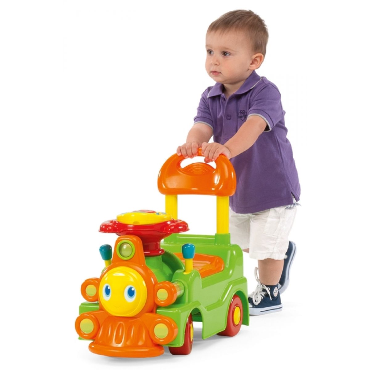 Tradiční a přitom nová Lokomotiva, která nabízí nové aktivity: elektronický panel na volantu se světly a zvuky, mechanické aktivity, úložný prostor pod sedátkem. Dva možné způsoby použití: jako chodítko, nebo jako odstrkávadlo.