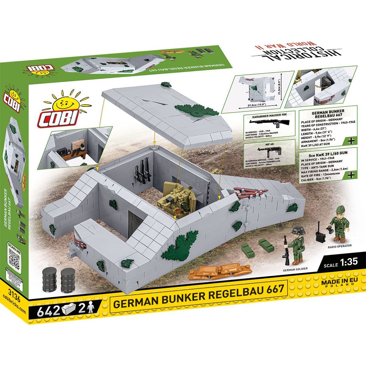 Ponorte sa do sveta vojenskej histórie s modelom nemeckého bunkra Regelbau 667! Postavte si túto pevnosť z Atlantického valu zo 642 kociek a dvoch figúrok. Model v mierke 1:35 je skvelým spôsobom, ako sa deti môžu hravou formou naučiť o opevneniach a ochrane vojakov počas vojny. Silné železobetónové steny bunkra poskytovali bezpečie pred nepriateľmi – teraz môžete mať vlastný kúsok histórie doma s touto stavebnicou od COBI.
