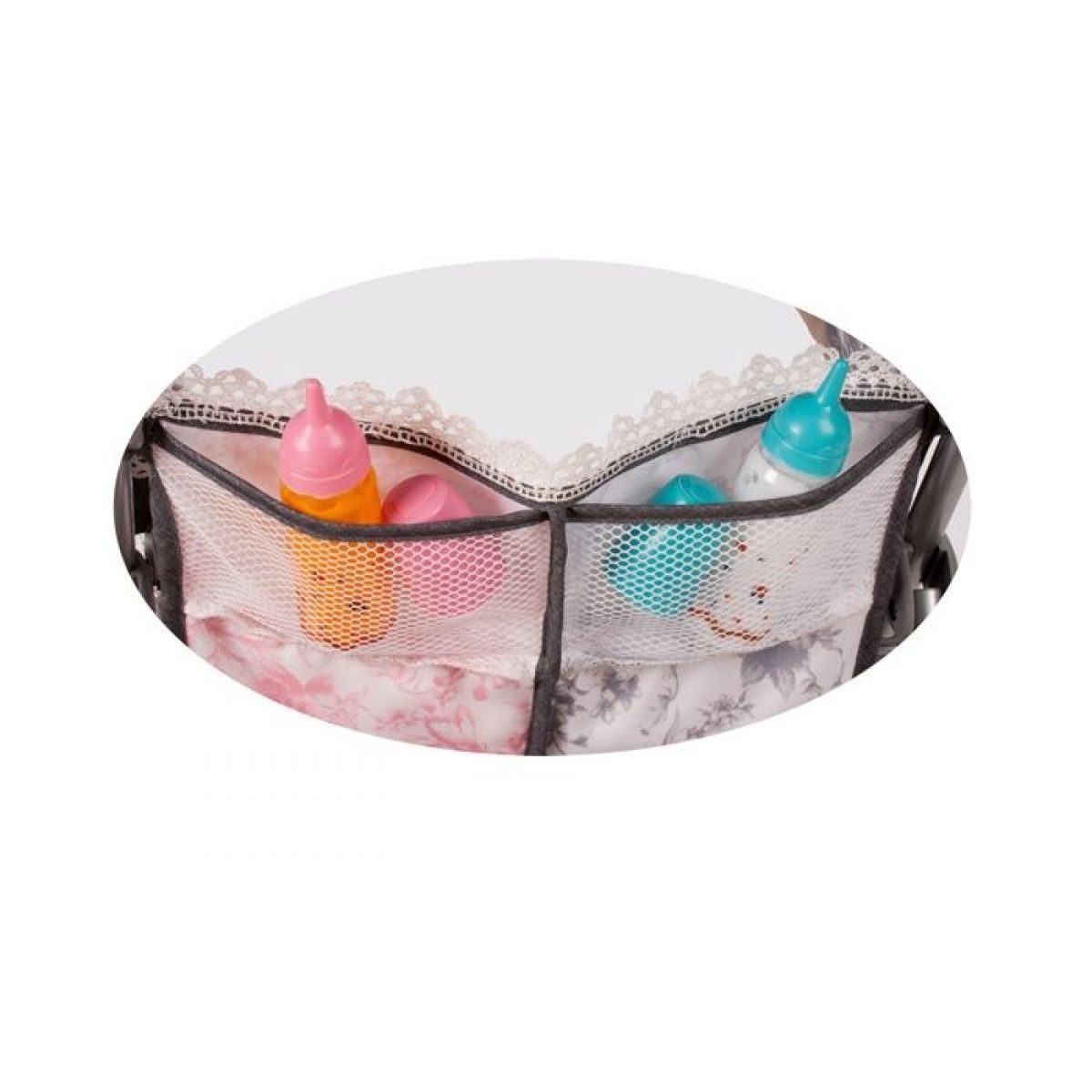 Kočárek je laděn do šedivé barvy a je zdoben květinovým vzorem a mašličkou.